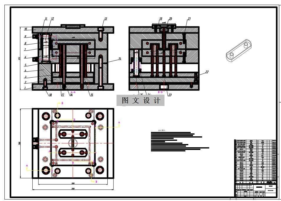 一起有cad装配图,型芯型腔塑件图,说明书。本文研究的是长条矩形的注塑成型。首先分析产品的成型工艺,然后根据产品结构,设计如何分型,及型腔数目,进胶方式。过程中要充分考虑到零件的加工方法,尽量简便精准,并进行相关尺寸的计算和校核,再设计浇注系统,冷却系统,排气系统,脱模机构,导向机构,以及模架的选择。通过CAD,UG ,等软件辅助分析设计是否合理,选择合理的工艺参数和设计方案。