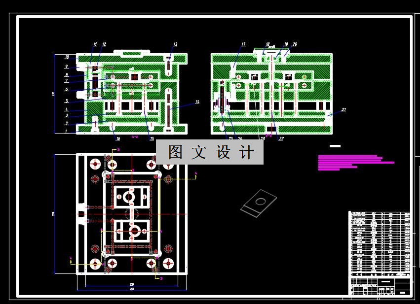 塑件三维,cad装配图,型芯,型腔,塑件图,说明书, 本课题主要是设计色牌注塑模设计,本说明书以图文结合的形式,对浇注系统、分型面、模具成型部分的结构、推出机构、冷却系统都有了较详细的论述。最后对有关参数的校核也有详细的计算。