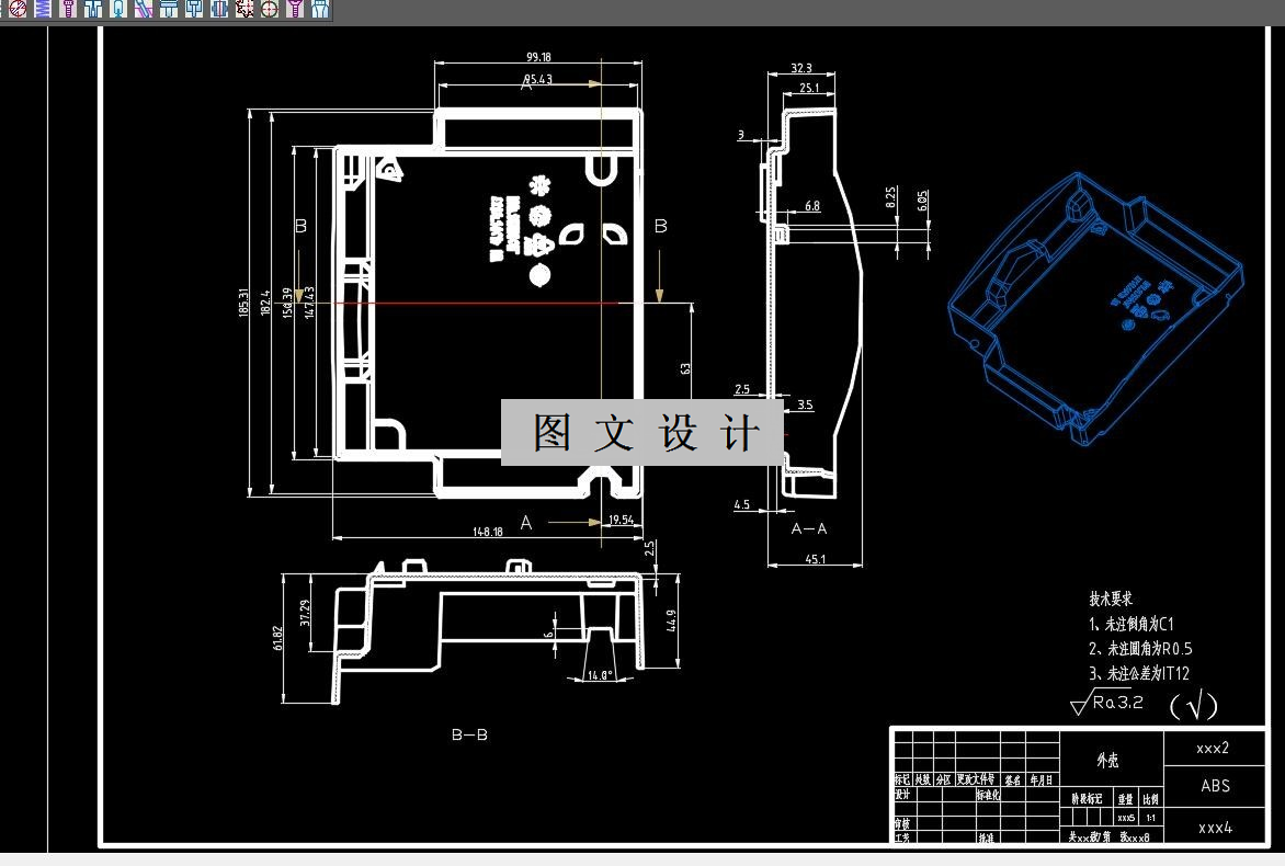 本设计采用CAD、UG软件,进行了塑料模具设计,根据注射模设计,分型面选择在大断面处,进行了浇注系统设计,成型后,塑件成型的产品放在注塑机上。设计需要计算塑件的尺寸,确定尺寸精度,然后注射机的选择。检查注塑机参数包括厚度,模具安装尺寸,模具闭模行程,注塑机锁模力等参数,所有符合要求在确定注射机的类型。在设计过程中,为了更清晰地表达模具的内部结构,所以有很多的模具结构和模具的局部图,并绘制二维图。