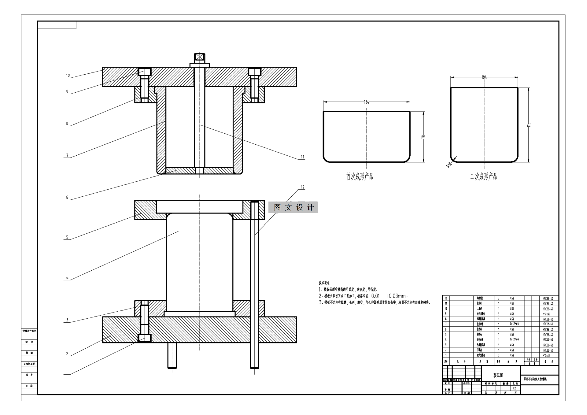 设计首先对冲模的基本成形机理及现状发展趋势做出简要阐释,指出冲模是一种低能耗高效率的产出方式,在综合分析产品工艺性指标及对比不同结构预案后,确定本次工件易采用连续模具的方案进行。 模具设计之前进行了排样结构设计和工艺计算两部分内容。第一部分通过排样参数选用和工件各工位的合理分解排布确定了包含冲裁,冲孔弯曲落料在内的多工位的合理结构,并以此为基础进行了第二部分,主要涵盖材料利用率,基本冲裁力参数,刃口精度公差等几部分的计算与校核,为后续模具结构具体实施打下基础。模具结构设计是在确保总体原则的情况下针对凸模,凹模,以及凸模固定板,辅助部件这几大方向完成了本体参数的设计和选用,最终将他们合理的装配,完成了本次工件级进模结构的设计。最后选用合理的压力设备与模具适配,以满足后续试模的需要。 在此次的设计当中,我翻阅查看了大量的模具设计资料,在异形不锈钢成形模具的设计与应用当中,和以前的设计方法相比较而言,模具的广泛应用,使得产品的质量得到了巨大的提升,模具的创新思路以及要求要紧跟现代化的步伐下,需要与未来的发展相结合。 本次设计的内容为异形不锈钢成形冲压模,完成冲孔、落料、拉深三道工序。使用AUTOCAD软件完成零件的绘制并完成装配图的绘制,进而完成装配工程图和相关的零件图。