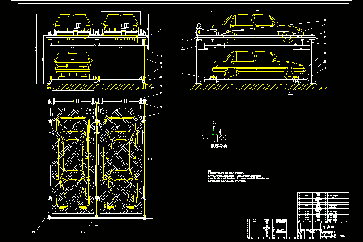 目前社会上有很多成熟技术的停车设备比如:升降横移类;垂直循环类;水平循环类;平面移动类;巷道堆垛类;垂直升降类;简易升降类。通过对这些车库类型特点的比较与分析,我最终选择了巷道堆垛类作为设计的车库类型。 以研究工作的进展顺序为序,分章、节逐一论述了课题的来源,目的及意义,设计过程,在设计中遇到的问题与难点及其解决方法与措施。在设计过程部分,详细论述了设备总体结构设计、横移传动系统设计、运输传动系统设计、存取车结构设计、控制系统设计和安全防护设计 。