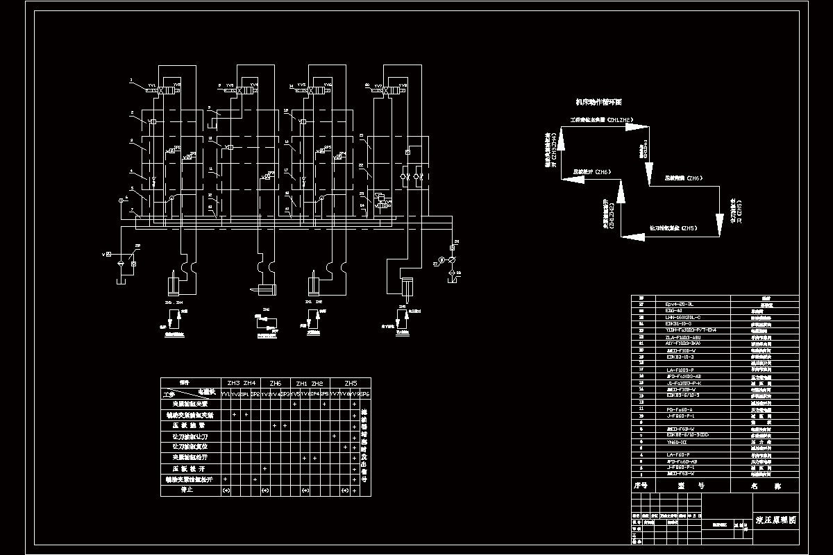 现在需要设计一台铣床的液压系统,要求完成的工作循环是:上料工件定位主夹紧→辅助夹紧→压板夹紧→让刀油缸让刀→让刀油缸复位→主夹紧油缸松开→压板松开→辅助夹紧松开→下料。在设计任务说明书中,已经直接给出了夹紧油缸;辅助夹紧油缸;铣刀让刀油缸的尺寸以及行程和速度等。因而,在这里面直接开始进行所需流量的计算。