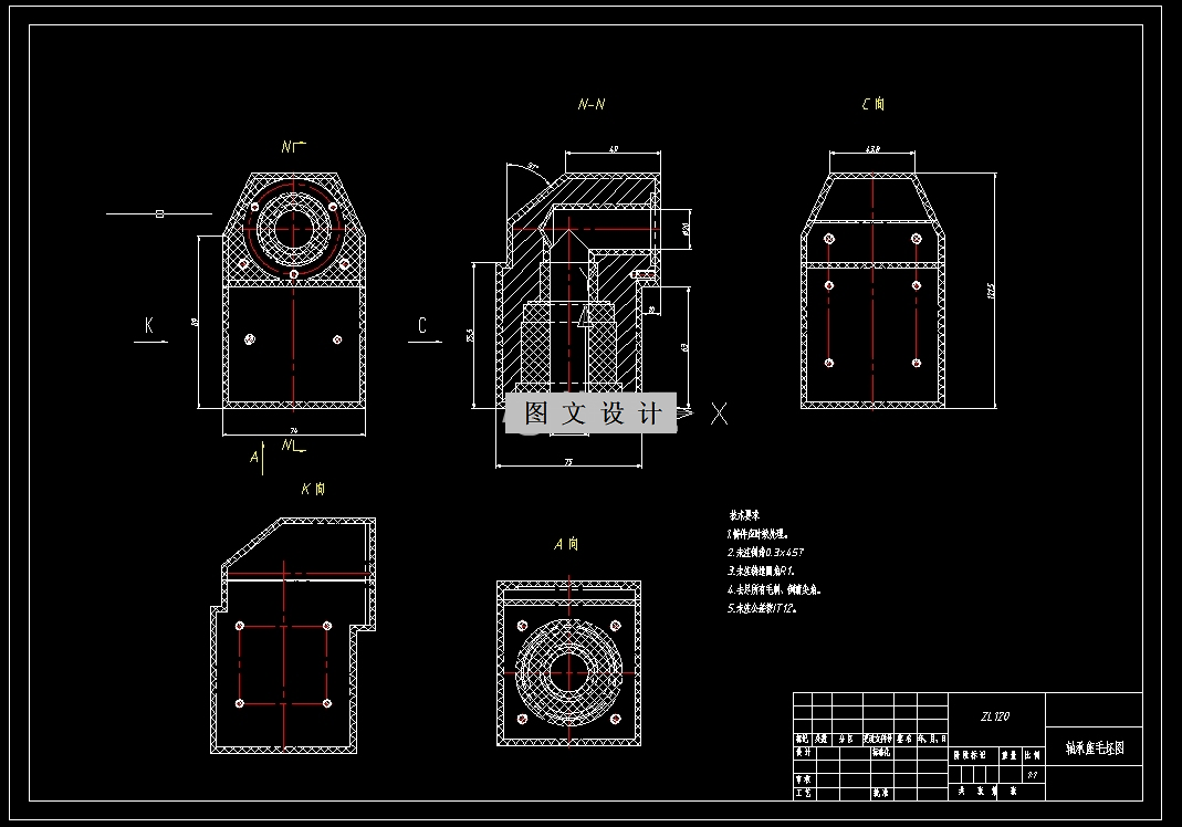 本次设计内容涉及了机械制造工艺及机床夹具设计、金属切削机床、公差配合与测量等多方面的知识。本次设计内容包含了轴承座的的工艺设计、工序设计以及钻后端面上2×M6螺纹底孔Φ5深18;攻2×M6螺纹深15钻夹具和铣端面设计三部分。在工艺设计中要首先对零件进行分析,了解零件的工艺再设计出毛坯的结构,并选择好零件的加工基准,设计出零件的工艺路线;接着对零件各个工步的工序进行尺寸计算,关键是决定出各个工序的工艺装备及切削用量;然后进行夹具设计,选择设计出夹具的各个组成部件,如定位元件、夹紧元件、引导元件、夹具体与机床的连接部件以及其它部件;计算出夹具定位时产生的定位误差,分析夹具结构的合理性与不足之处,并在以后设计中注意改进。