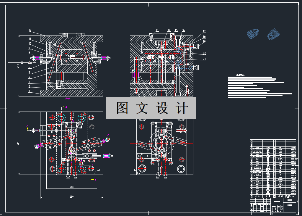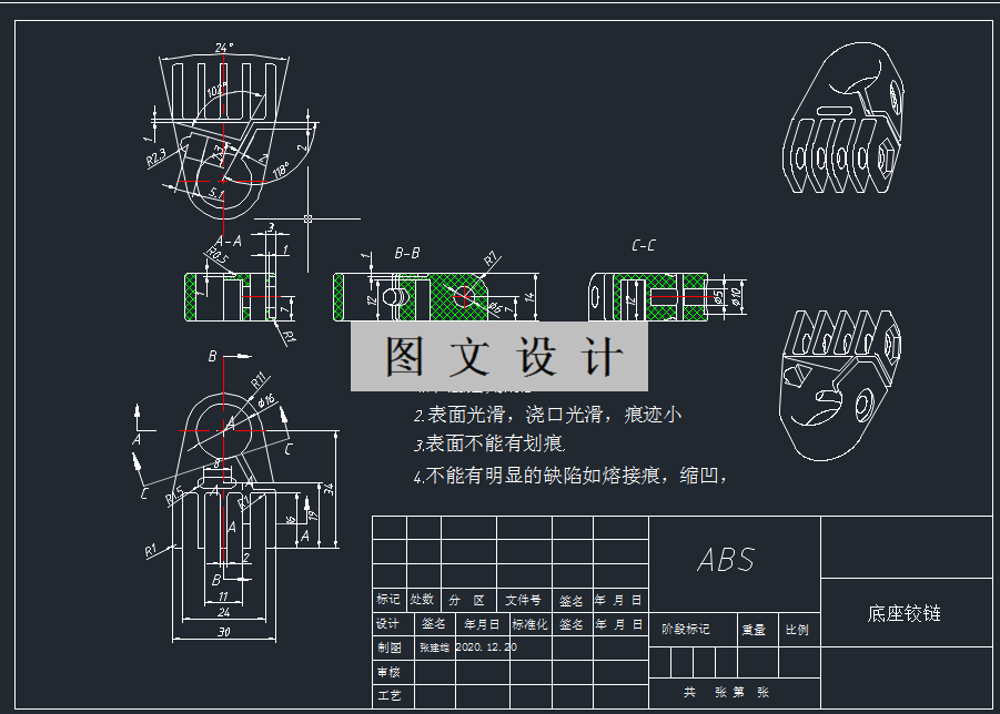 本文研究的是底座铰链的注塑成型模具设计。在本次模具毕业设计中首先按照所找的底座铰链实物,绘制出底座铰链三维图,通过分析它结构复杂程度以及尺寸精度要求来设计合理的模具方案,接着对产品的塑料原材料进行了选择并做出分析,分型面位置选在了沿着产品底面形成的最大轮廓面处,型腔数目决定采用一模两腔结构,型腔排布采用一字型排列方式,由于产品表面要求不高,所以选择了侧浇口浇口类型,脱模机构选择了常用的推杆脱模方式。由于产品上对陈侧孔结构,还需要为模具产品成型设计斜导柱侧向分型抽芯机构,最后对冷却系统进行计算并布置了冷却水道,本次设计所选注塑机型号为XY-XZ-125,最后对注塑机注射量,锁模力以及开模行程等几个主要参数进行了校核。