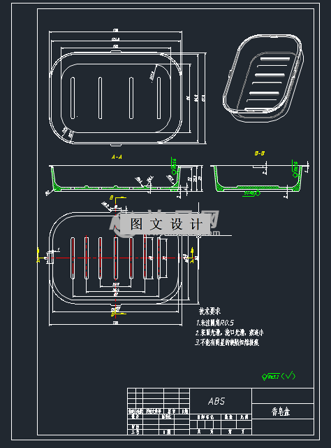 随着人们越来越多的使用塑料制品,且塑料工业的快速发展,注塑模具逐渐受到人们和世界工厂的关注,本文重点讨论和研究了香皂盒下盖的注塑模具设计,香皂盒下盖是一种常见的日常生活用品,可用于储放香皂,本文主要对成型香皂盒下盖模具方案各个机构方案进行了详细的研究与设计,首先分析了香皂盒下盖工艺结构,综合材料所需性能并对ABS材料选择,然后选取了分型面的位置并确定型腔数目设计了一字型排布方式,对模具的浇注系统、脱模机构、模具冷却以及排气系统都做了相应的设计。本次模具设计所选注塑机型号为海天HTF160,对注塑机主要参数进行了校核。由于此次模具采用了侧浇口的浇口类型,所以为模具选择CI龙记大水口两板标准模架。