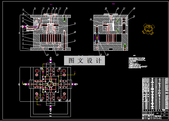 本文研究的主要内容是包括塑件的工艺分析、选择注射成型设备、设计成型方案、模具成型零件与推出机构的设计等。具体包括分析主要结构特点、计算塑件体积、注射量和凹凸模的尺寸;设计主流道、分流道、浇口、冷却系统;选择合适的脱模机构、确定合理的型腔数目和排列方式。