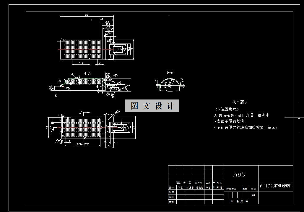本文研究的主要内容是洗衣机滤网注塑模具设计,主要包括塑件的工艺分析、选择注射成型设备、设计成型方案、模具成型零件与推出机构的设计等。具体包括分析主要结构特点、计算塑件体积、注射量和凹凸模的尺寸;设计主流道、分流道、浇口、冷却系统;选择合适的脱模机构、确定合理的型腔数目和排列方式。在经过对塑件进行结构和工艺性分析之后,该洗衣机滤网外形尺寸属于中型塑件,且塑件外观无特殊要求。利用Proe和AUTO CAD软件绘制了二维图和三维图,在清楚地表达模具结构的同时,也缩短了设计时间,提高了效率。