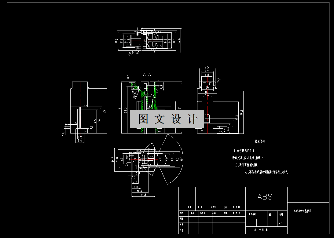 本次课题的目的是设计一副注射模具来生产车用防水接插件,从而实现大批量自动化生产。针对车用防水接插件的模具设计,经过查找资料且对此塑件进行结构与工艺分析,决定采用注射模。车用防水接插件采用ABS材料,该材料在日常生活中有着广泛的应用。此次设计从车用防水接插件的工艺性与相应的模具结构出发,对模具的成型零部件、注塑模推出机构、加热与冷却系统、浇注系统、排气系统、支承零部件的选择、注射机的选择以及相关参数的校核等都有着详细的计算过程。设计中主要运用PROE与CAD软件对车用防水接插件的三维模型与模具的装配图与零件图进行绘制,不但提高了工作效率且大大缩短了设计工作的时间,且加深了对软件的操作与运用。此次设计过程表明该模具能够达到车用防水接插件所要求的加工工艺。