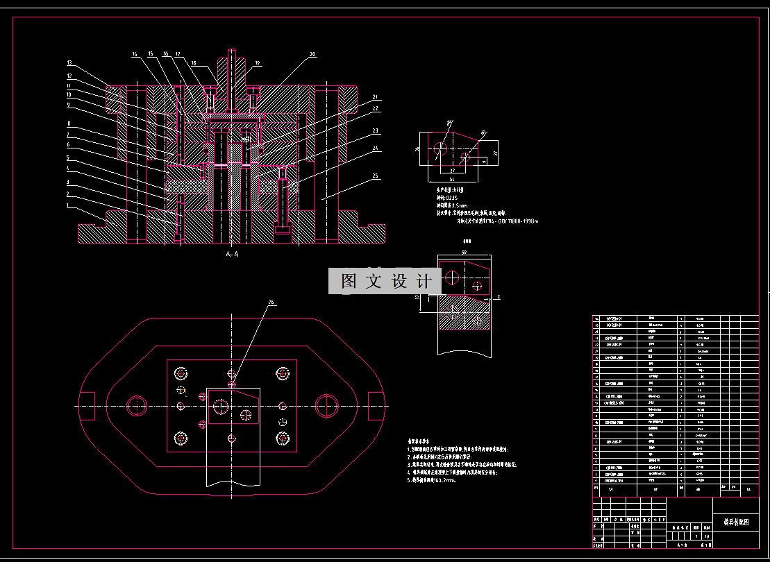 本设计运用冲压成形工艺及模具设计的基础知识,首先分析了冲裁件的冲压工艺性,为确定冲裁工艺方案做好了准备;然后计算冲裁力和模具刃口尺寸,便于选取压力机及确定工作零件的尺寸和结构;最后分析了制件的特征,确定模具的设计参数、设计要点及推件装置的选取。 本冲裁件上孔为非规则形状的孔,为了便于冲孔凸模的加工,所以在设计时把冲孔凸模设计成直通式,然后,将其铆接在凸模固定板上。此外,该制件的尺寸较大,为保证凹模的加工精度,在设计时应将其设计成凹模组件。为了方便制件的取出,本副模具采用倒装结构形式,同时,为了简化模具结构采用弹性推件装置。 1146570