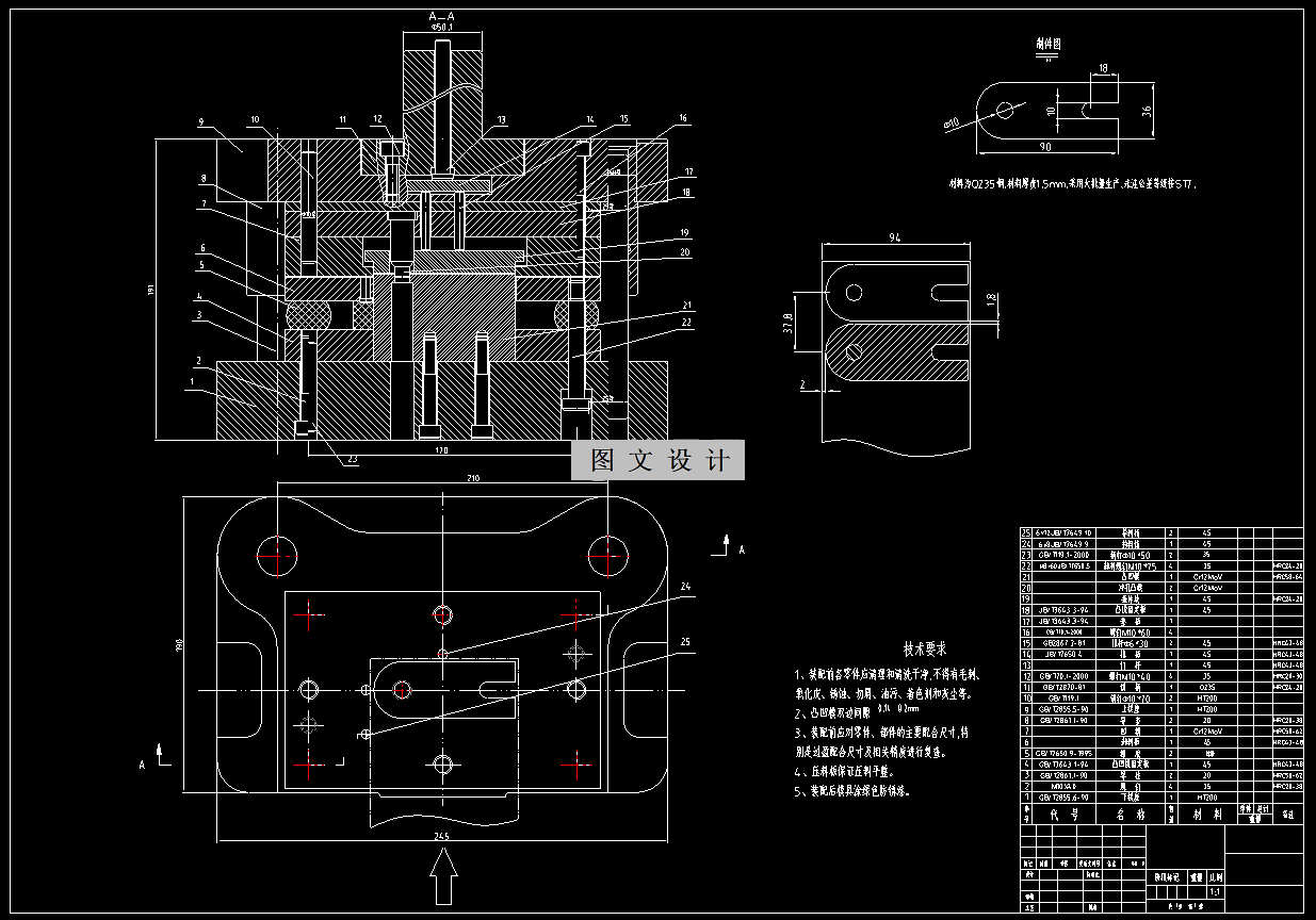 垫板冲压模具 零件的生产批量不是很大,合理安排生产采用手工送料方式能够达到批量要求,且能降低模具成本,因此采用手工送料方式;为了便于操作,提高生产率,采用弹性卸料方式,凸模与卸料板推下的出件方式。考虑零件厚度较后,模架类型及精度,采用后导柱模架。 1146567