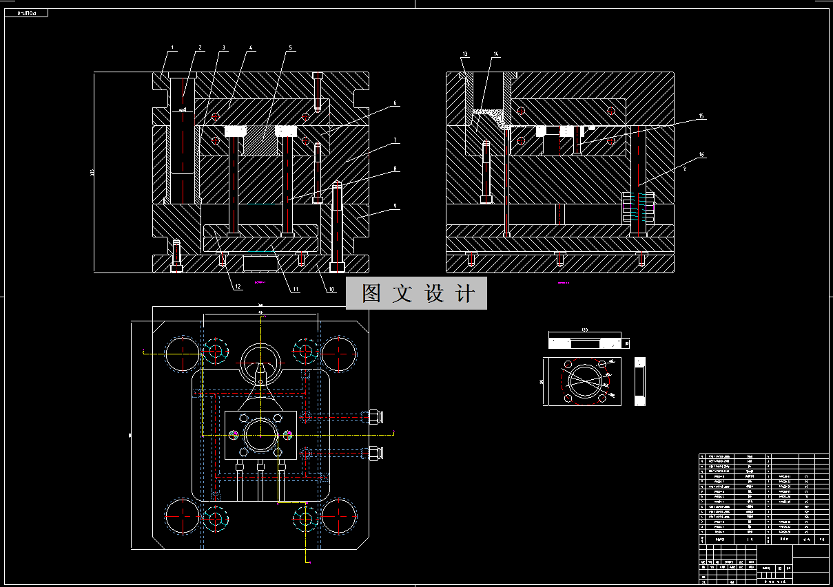 该模具图是一个封盖的铝合金压铸模,1出1,产品进料、渣包、排气的位置都有设计(加排气阀)。因产品侧面有孔,现模具采用后模行位,前后模走运水(运水设计不能像塑胶模那样设计),包含唧嘴(走运水,需要设计防水圈),最后顶针顶出产品。图档结构清晰,可以参考借鉴。