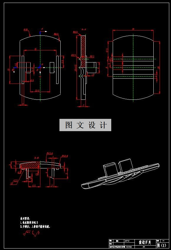 在现实生活里,充斥着各种电器产品,拨动开关是我们偶尔能见到的。本次设计的制品为拨动开关,利用CAD软件对拨动开关及模具进行三维造型,模架选取,装配图和零件图。从塑料产品成型特征、分型面的选择、浇注系统设计、型芯和型腔结构设计,推出机构设计、冷却系统设计、导向机构设计等多方面详细阐述了拨动开关注塑模具的设计过程。同时合理地选择了注塑机,并对注塑压力,锁模力,顶出力等注射工艺参数进行校核,进一步保证了设计的合理性。如此设计出的结构可确保模具工作运用可靠。最后对模具结构与注射机的匹配进行了校核,绘制了一套模具装配图和零件图。