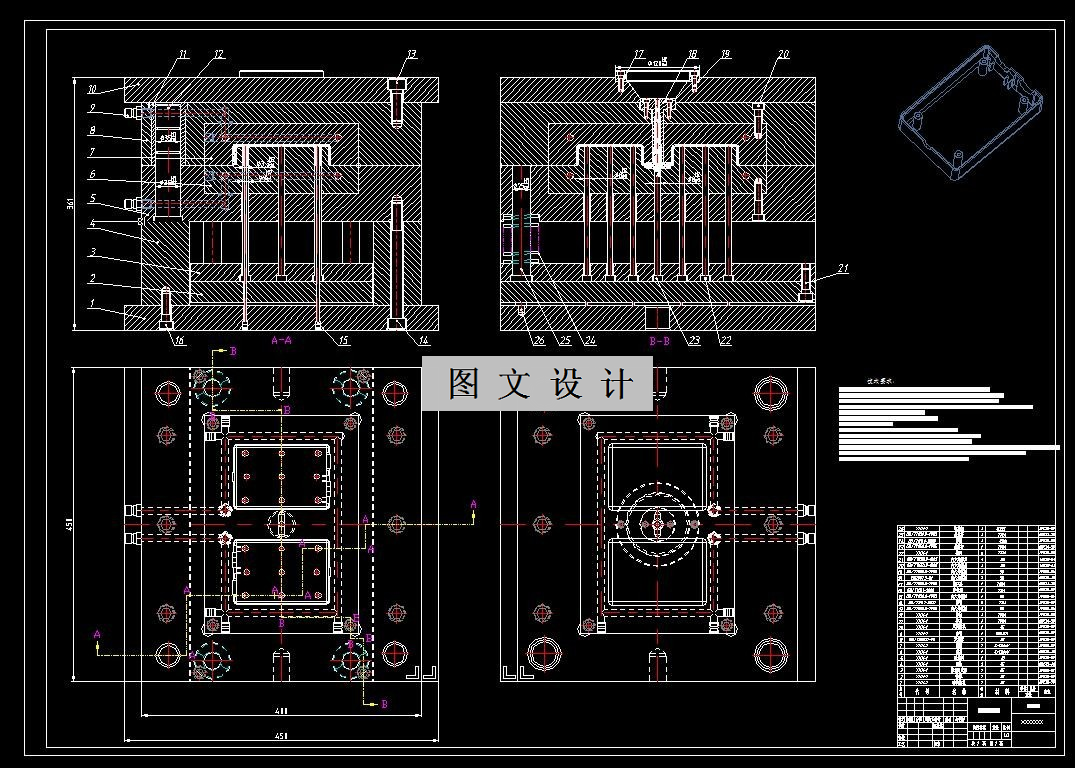 在本次模具设计中首先根据指导老师所发任务中控制盒绘制出控制盒盖三维图,通过分析它结构复杂程度以及尺寸精度要求来设计合理的模具方案,接着对产品的塑料原材料进行了选择并做出分析,初选了注塑机型号为HTF160J/TJ。由于产品有装配要求,尺寸精度要求比较高,型腔数目决定采用一模两腔结构,型腔排布采用一字型排列方式,本次设计分型面位置选在了沿着产品底面形成的最大轮廓面处,由于产品表面要求不高,所以选择了侧浇口浇口类型,本次设计的脱模机构选择了推杆和推管推出方式。然后为本次塑料模具设计设计一套模具冷却系统。最后对注塑机主要参数进行了校核。