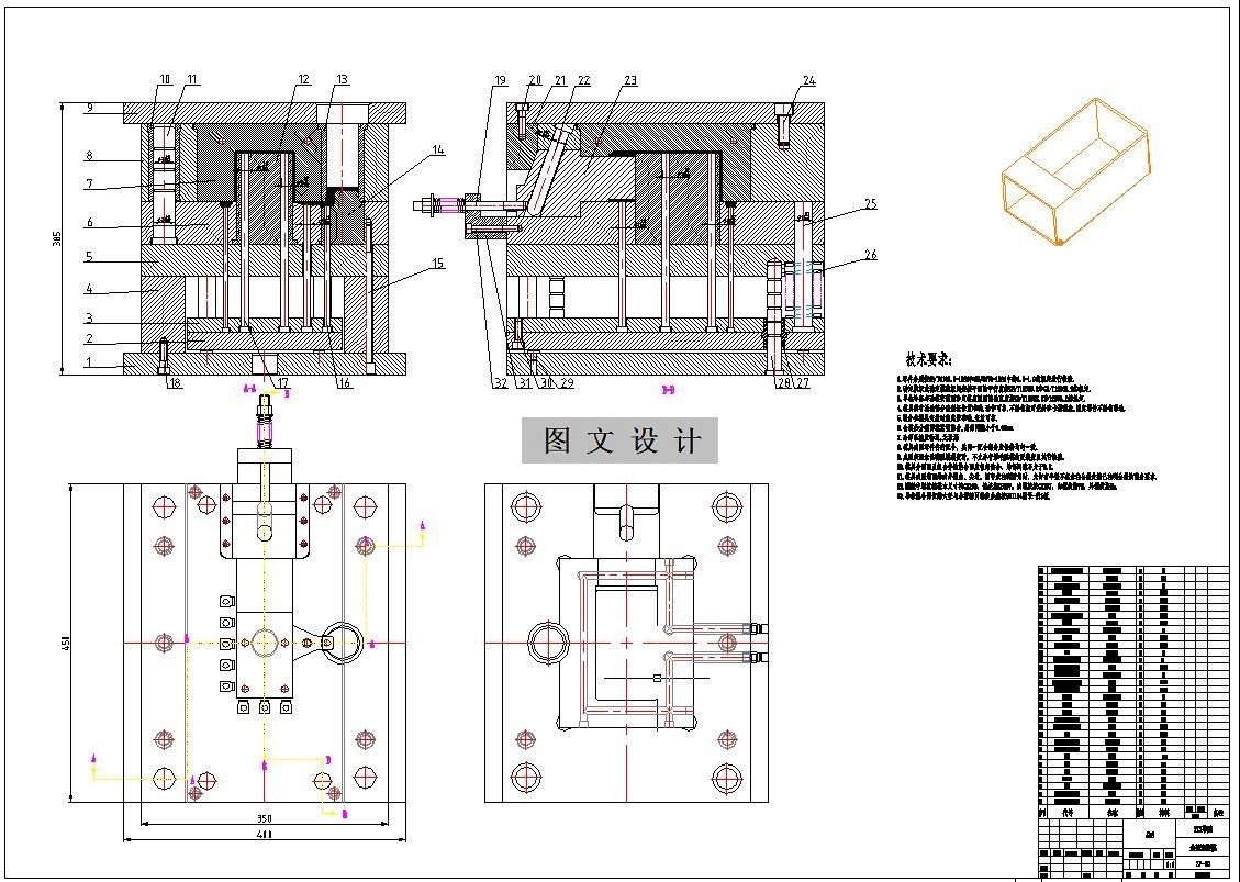 根据零件的结构和尺寸设计了完整的模具。设计内容主要包括:浇注系统设计、成型零件设计、推出机构设计以及模体结构设计。根据铸件的形状特点、零件尺寸及精度,选定了合适的压铸机,通过准确的计算并查阅设计手册,确定了成型零件以及模体的尺寸及精度,在材料的选取及热处理要求上也作出了详细说明,并在结合理论知识的基础上,借助于计算机辅助软件绘制了各部分零件及装配体的立体图和工程图,以保障模具的加工制造。 根据有关资料,采用扁平侧面浇注系统,降低了浇注时金属液对型芯的冲击,确定了铸造工艺参数:铸件加工余量取0.1~0.75mm,收缩率为0.4~0.7﹪,脱模斜度为25′~45′。模具整体尺寸为400×450×385mm,符合所选压铸机安装空间。推出机构采用6根端面直径8mm的圆截面推杆,推杆兼复位杆作用。经计算,推杆受力符合要求。通过电脑模拟显示,模具能够正常工作,开启灵活。