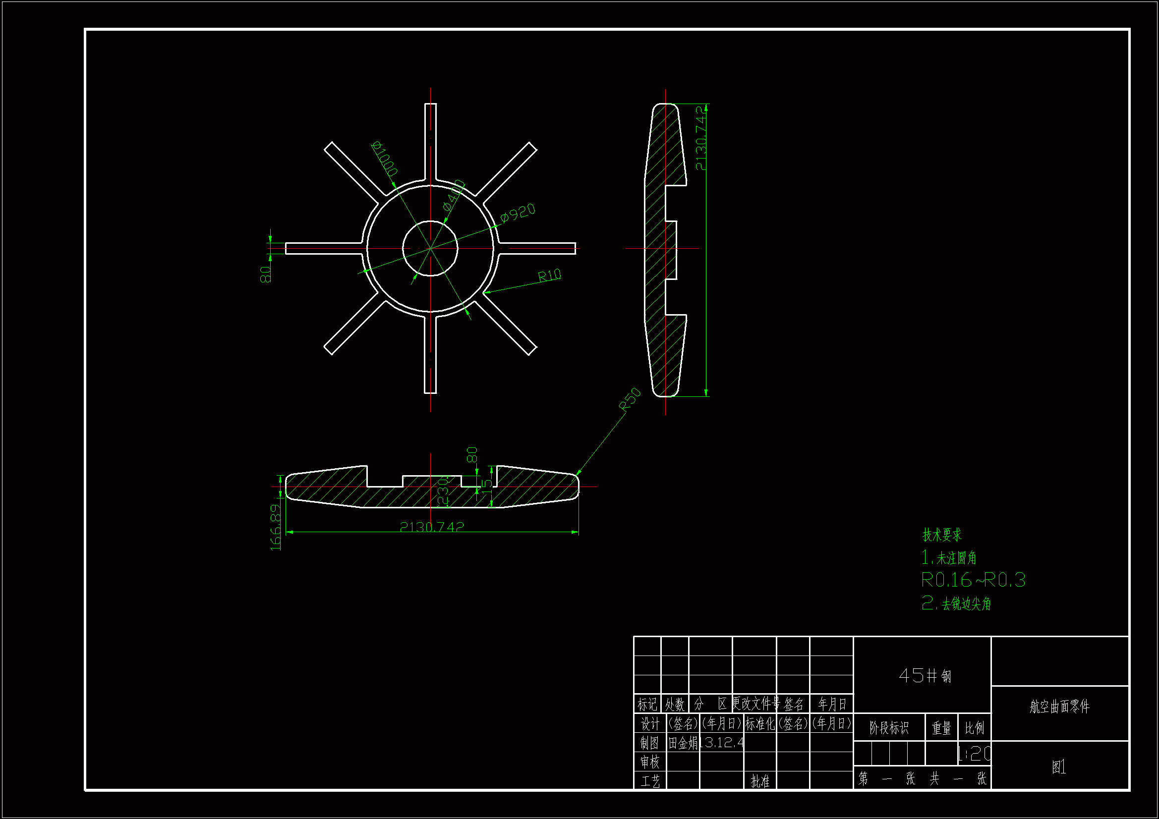 电解加工又称电化学加工,是金属工件在电解液中发生阳极溶解的一种加工过程。电解加工对难加工材料可以以柔克刚,对形状复杂的零件可以一次成型,并以表面质量好、生产率高、无工具损耗、无切削应力等优点,在制造业中发挥着重要作用。论文通过对航空曲面零件进行分析,设计出一套电解加工工装。电解加工工装包括阴极的设计计算、流场的设计计算以及零件的定位等。阴极的设计采用等间隙分布的原则,在零件原有尺寸上缩小一定的间隙,来设计阴极。根据不同的加工方式可以有不同的加工间隙,这里取加工间隙为0.5mm。对于流场的设计,根据零件的特点采用侧流式加工,在流场设计时还要确定电解液流速和进口压力。另外,流场的设计要均匀,均匀性是指加工面上各处流量充足、均匀,不发生流线相交和其他流场缺陷——如空穴现象、分离现象等。另外,工装的设计要保证良好的密封性。通过设计电解加工工装加工航空曲面零件比机械切削加工省时省力,与机械切削加工相比电解加工的表面质量好,且加工范围广,没有切削应力。