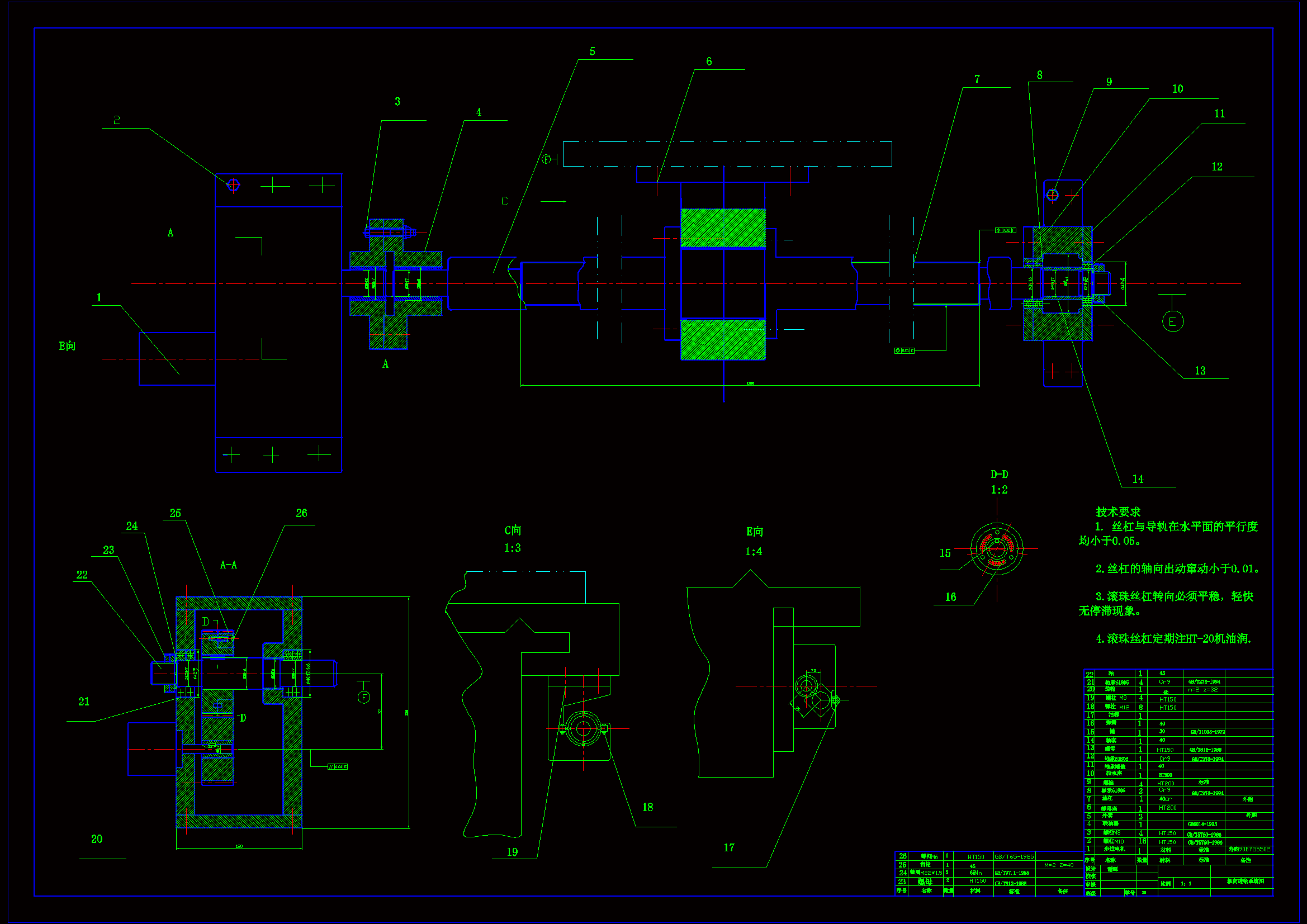 本文主要阐述了将CA6140普通车床改成经济型数控车床,通过总体方案的设计,考虑机床的类型、传动方式和执行机构的选择等;针对车床的进给机构,计算出负载转矩和转动惯量,并根据计算结果分析各结构特点,确定横向传动链的方案,采用步进电机经减速机构和滚珠丝杠相连接机构,噪声低、可靠性高。由于它属于经济型数控机床,在保证一定加工精度前提下,应该简化机构、降低成本,因此,进给伺服系统采用步进电机开环控制系统。计算选择步进电机、齿轮副联轴器、滚珠丝杠螺母副等。其中步进电机的选择包括确定系统的脉冲当量和步距角的选择以及根据距频特性来校核点击能否满足要求;通过对最大工作载荷和最大动载荷的计算初步确定滚珠丝杠螺母副的型号,再校核它是否稳定合格。根据选型的数据绘制出滚珠丝杠螺母副图以及装配图。
