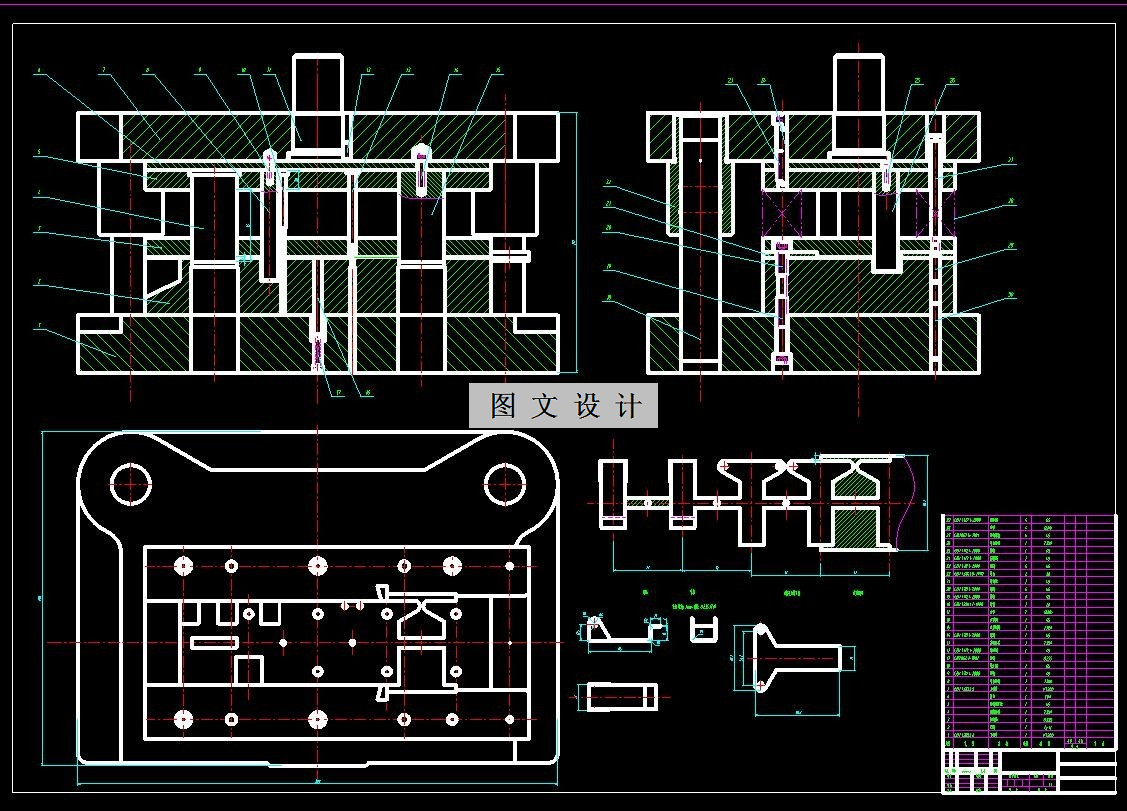 本次设计首先分析产品的工艺性能,按照拿到的毕业设计工件图,从加工的角度对于工件进行工艺分析,基于对尺寸的大小,所用精度的高低,原材料的选择方面的分析结果。然后列出冲裁方案,确定本次零件加工的最佳方案是通过落料冲孔弯曲工序,使用落料冲孔弯曲级进模具完成产品的冲压加工。尽可能做到所生产的工件用比较简单的模具,比较少的工序,生产费用适中,加工效率较高的情况下,获得保质保量的零件。进行相关工件的冲裁工艺计算和压力机的选择,然后对一些主要的零件进行计算与设计,组后完成整个装备图和零件图的绘制。