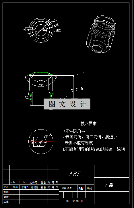 本文研究的是挂环的注塑成型模具相关设计。在本次模具设计中我们首先准备了家用海绵拖把挂环零件图,绘制出了家用海绵拖把挂环产品三维图,通过分析它的外部结构形状结构和尺寸大小以及精度来拟定合理的模具设计方案,产品体积通过三维软件分析获得,并初选了注塑机型号为HTF86J/TJ。本次设计分型面位置选在了塑件的上表面和中间面,型腔数目决定采用一模两腔结构,型腔排布采用直线排布,哈弗滑块成型产品侧凹和外表面,在浇口类型上选择了点浇口类型,在制品的脱模机构上我们采用推管推出不锈钢管连接挂环的方式来推出产品。最后设计一套模具冷却系统,这样能够提高产品的成型质量。最后对注塑机主要参数进行了校核。