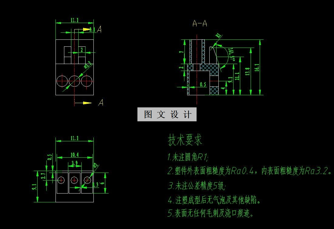 本课题主要是针对接线头注塑模具设计,该接线头材料为丙烯晴-丁二烯-苯乙烯(ABS),是工业生产中常见的一种保护盖产品。通过对塑件进行工艺的分析和比较,最终设计出一副注塑模。该课题从产品结构工艺性,具体模具结构出发,对模具的浇注系统、模具成型部分的结构、侧抽机构、顶出系统、冷却系统、注塑机的选择及有关参数的校核都有详细的设计,同时并简单的编制了模具的加工工艺。通过整个设计过程表明该模具能够达到此塑件所要求的加工工艺。根据题目设计的主要任务是接线头注塑模具的设计,也就是设计一副注塑模具来生产塑件产品,以实现自动化提高产量。针对塑件的具体结构,该模具采用侧浇口的单分型面注射模具。