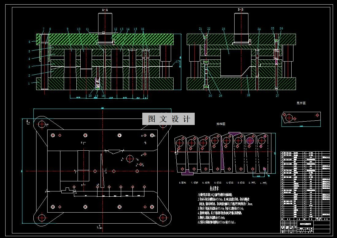 通用模具设计流程:刚开始应该进行工艺分析,通过工艺分析对工件支架的结构和材料以及工序有个基本的了解,然后设计出合适的方案。方案设计完成以后,需要计算模具的设计,包括工件布局利用率的计算、冲裁压力的计算和模具工作尺寸的计算。通过分析总结完成本次模具的最终设计,然后通过图纸表达出模具的结构,完成零件图进行加工。 设计的工件为汽车离合器支架零件,首先仔细的对支架进行分析,分析一般包含三个方面,分别是材料分析,结构分析和工序分析。该工件支架材料为10钢,属于常用的钣金类材料,冲压性能比较好,结构上总体来说结构基本属于对称,厚度是1.0mm。制造该汽车离合器支架片主要包括冲孔、落料、弯曲等工序,可通过汽车离合器支架片连续模完成。由于同时完成了多个过程,可以保证高的生成效率,同时还能提高工件的质量。设计的这套模具运行比较稳定。