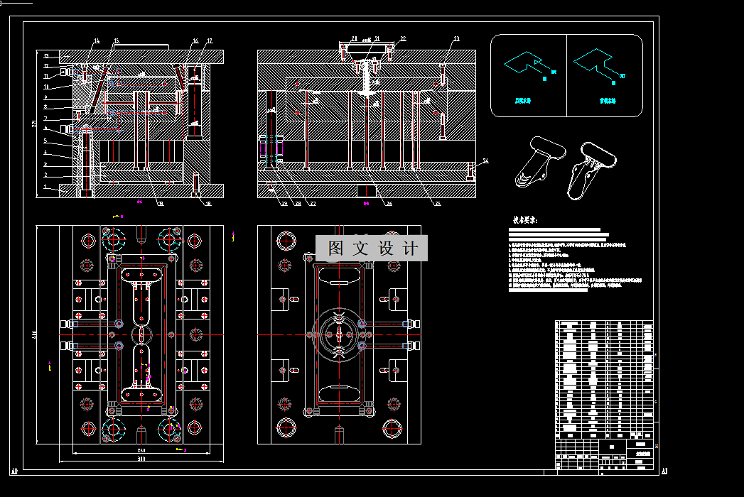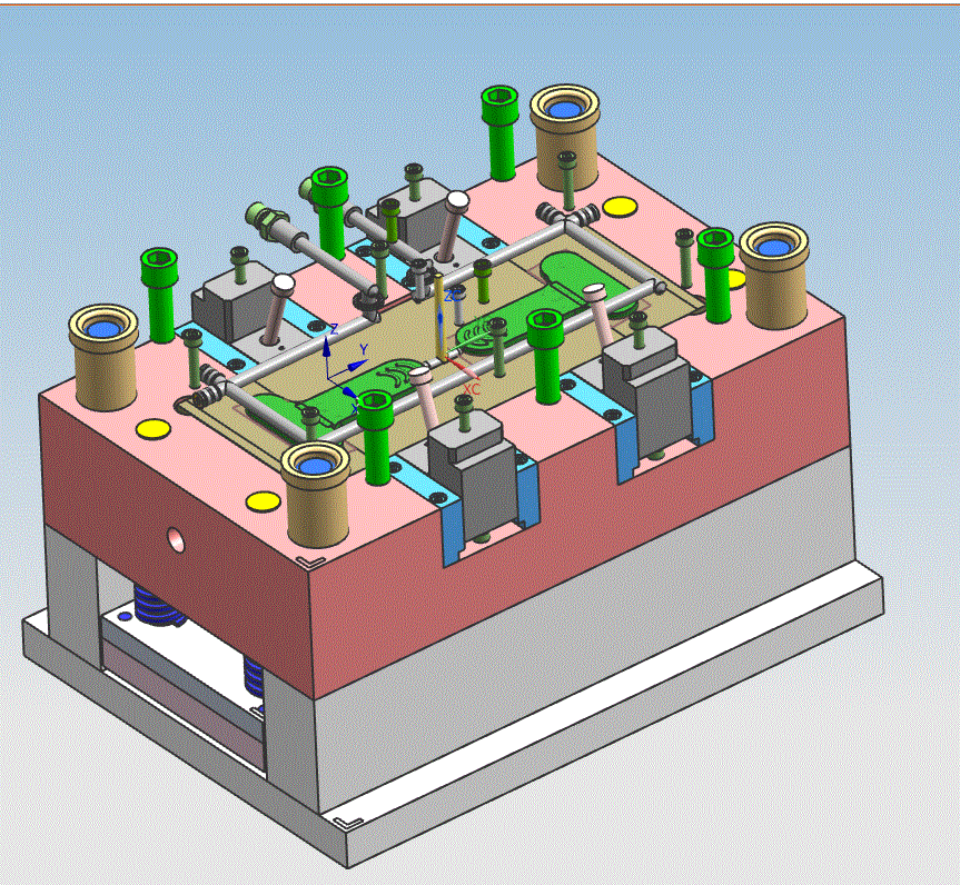 参考资料手机支架夹体注塑模具设计主题。模具为一模两腔,侧浇口,塑件上侧凹结构采用斜导柱抽芯机构成型,推杆推出,本资料含有模具装配图、模具三维、多张模具零件图,模具设计说明书等等