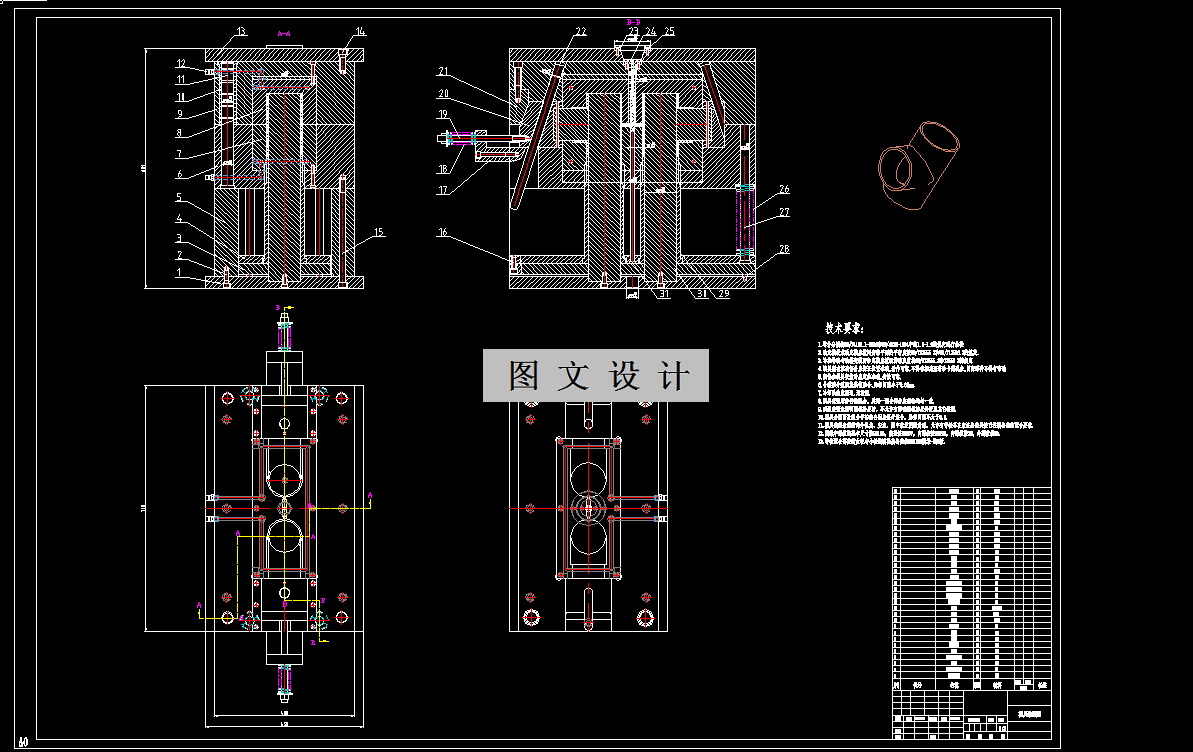 参考资料三通管注塑模具设计主题。三通内径为φ32mm,模具为一模两腔结构,采用了潜凸模浇口,塑件中部侧孔结构采用斜导柱抽芯机构成型,推管推出三通,本资料含有模具装配图、模具三维、多张模具零件图