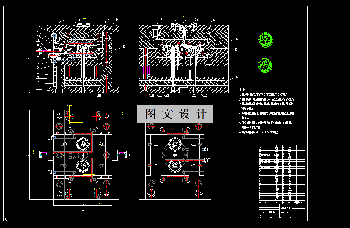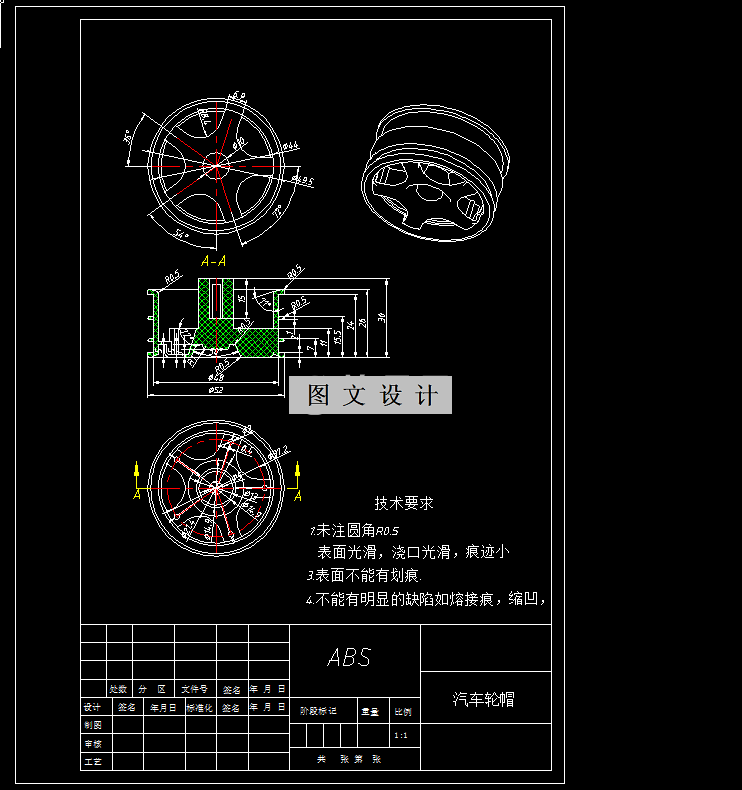 参考资料为玩具车轮帽轮毂注塑模具设计主题。模具为一模两腔,侧浇口,塑件上一圈侧凹结构采用斜导柱抽芯机构成型,产品中部采用推管,周围几条条幅上采用推杆推出,本资料含有产品零件图、模具装配图、模具三维、多张模具零件图