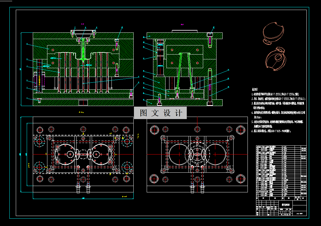 进行注塑模具的设计首先需要对产品进行仔细分析,考虑浇注系统,型腔分布以及导出机构的分布。在本次设计中,对生产工艺方案也做了初步的探讨。模具为一模两腔,侧浇口,塑件上圆孔结构采用斜推杆抽芯机构成型,推杆推出,本资料含有模具装配图、模具三维、多张模具零件图等等