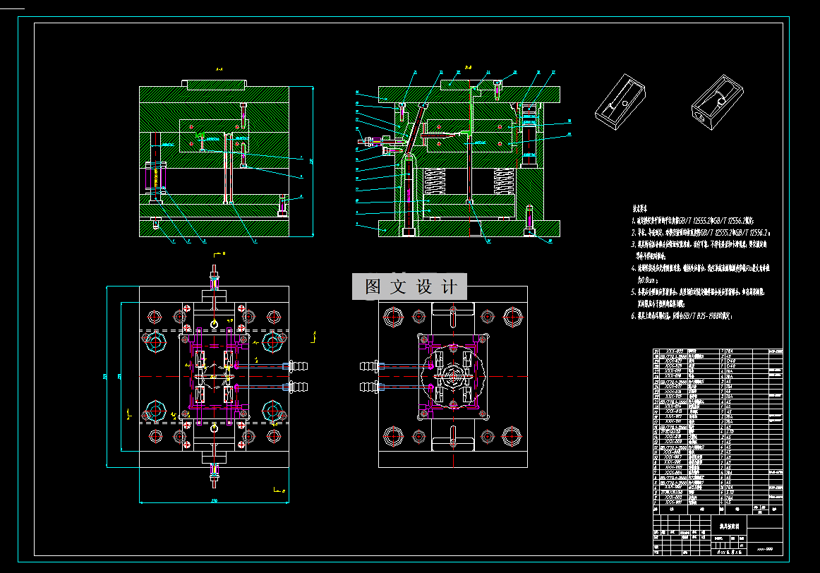 参考卷笔刀刀头注塑模具设计主题。模具为一模四腔,侧浇口,塑件上侧凹结构采用斜导柱抽芯机构成型,推杆推出,本资料含有模具装配图、模具三维、多张模具零件图,模具设计说明书等等