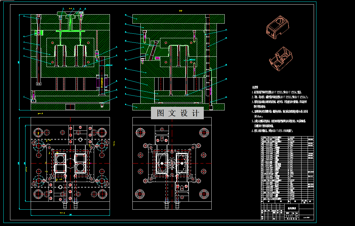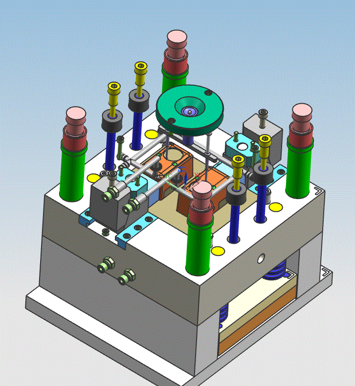 参考资料卷笔刀削笔刀盒盖注塑模具设计主题。模具为一模两腔,点浇口,塑件上侧凹结构采用斜导柱抽芯机构成型,推杆推出,本资料含有模具装配图、模具三维、多张模具零件图等等
