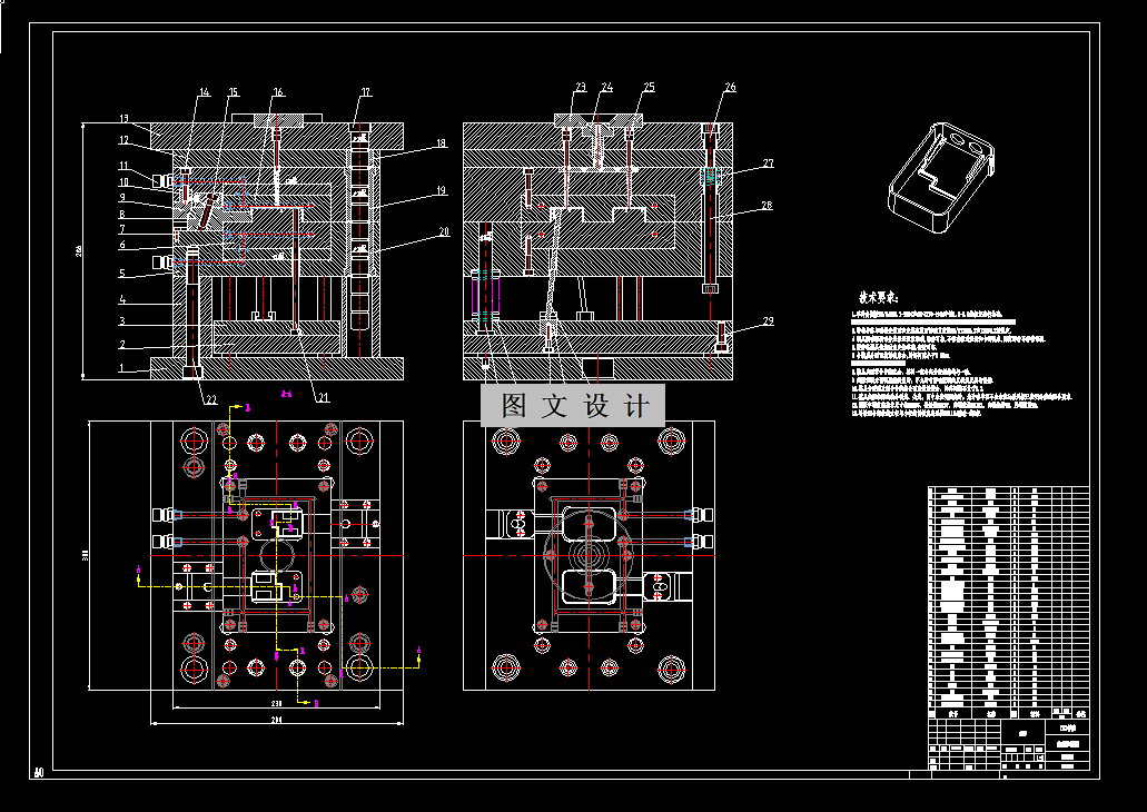 本次设计主要是通过对塑件的形状、尺寸及其精度要求进行注射成型工艺的工艺分析、侧向分型与抽芯机构设计,重点在侧抽芯机构的设计。在这过程中分析了模具受力,推出脱模机构的设计,合模导向机构的设计,冷却系统的设计以及排气系统等,并绘制完整的模具装配总图和主要的模具零件图。设计中力求模具结构设计简单、合理、实用,使得模具结构紧凑、工作可靠,可实现全自动操作。模具一模两腔结构,点浇口点在产品顶部处,塑件上侧凹结构采用斜导柱抽芯机构成型,推杆推出,本资料含有模具装配图、模具三维、多张模具零件图