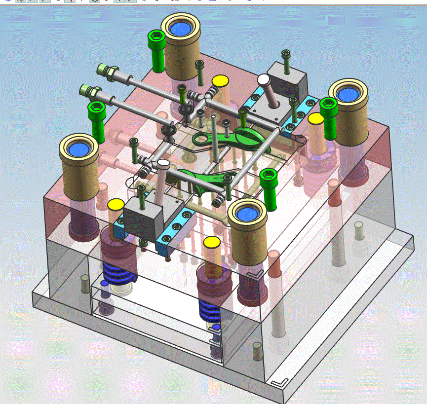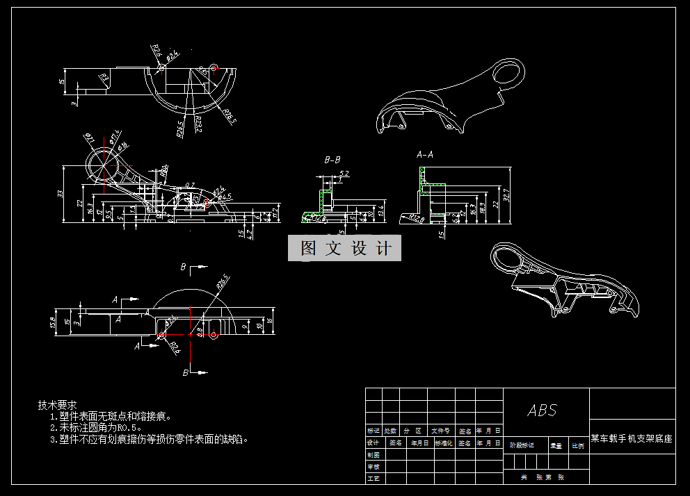 首先从车载手机支架底座实物入手分析研究,接着对车载手机支架底座的相关工艺性进行了分析,主要任务是根据任务书中所指定的要求,完成相关模具的结构设计,在展开车载手机支架底座模具结构设计之前,通过多次在网上查找翻阅有关注塑模具国内外设计及发展的参考文献,对注塑模具结构、作用以及工作原理有所了解和掌握,本次模具设计浇注系统采用的一模两腔侧浇口进胶、脱模机构采用的最常用的推杆脱模方式、本次设计所选注塑机的选择型号为XS-ZY-125。最后对成型相关零部件进行了结构设计,采用了整体式型芯、型腔,对模具温度控制系统也进行相关设计及计算,采用了最常用的环形冷却水道结构。在我们的整个设计多次运用大学期间所掌握的三维软件和二维软件进行了图纸的绘制,完成了老师所布置的任务。