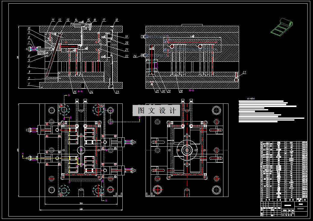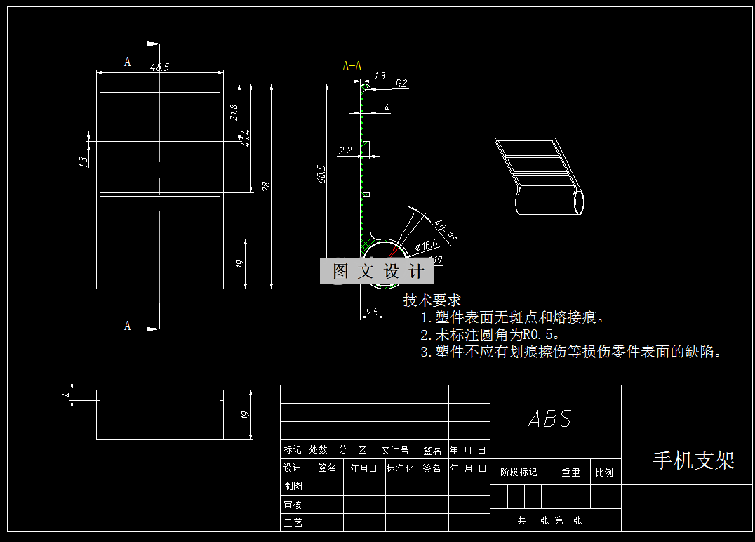 通过分析它的外部结构形状结构和尺寸大小以及精度来拟定合理的模具设计方案,并对产品的塑料原材料进行选择并作出主要性能分析,产品体积通过三维软件分析获得,并初选了注塑机型号为XS-ZY-250。本次设计分型面位置进在了产品底面最大轮廓面面积处,型腔数目决定采用一模四腔结构,型腔排布采用H型排布,在浇口类型上选择了侧浇口类型,在制品的脱模机构上我们采用推杆推出手机支架的方式来推出产品。由于产品存在侧孔结构,需要设计抽芯机构成型,最后经过分析,认为此次的塑料模具设计还需要设计一套模具冷却系统,这样能够提高产品的成型质量。最后对注塑机主要参数进行了校核。
