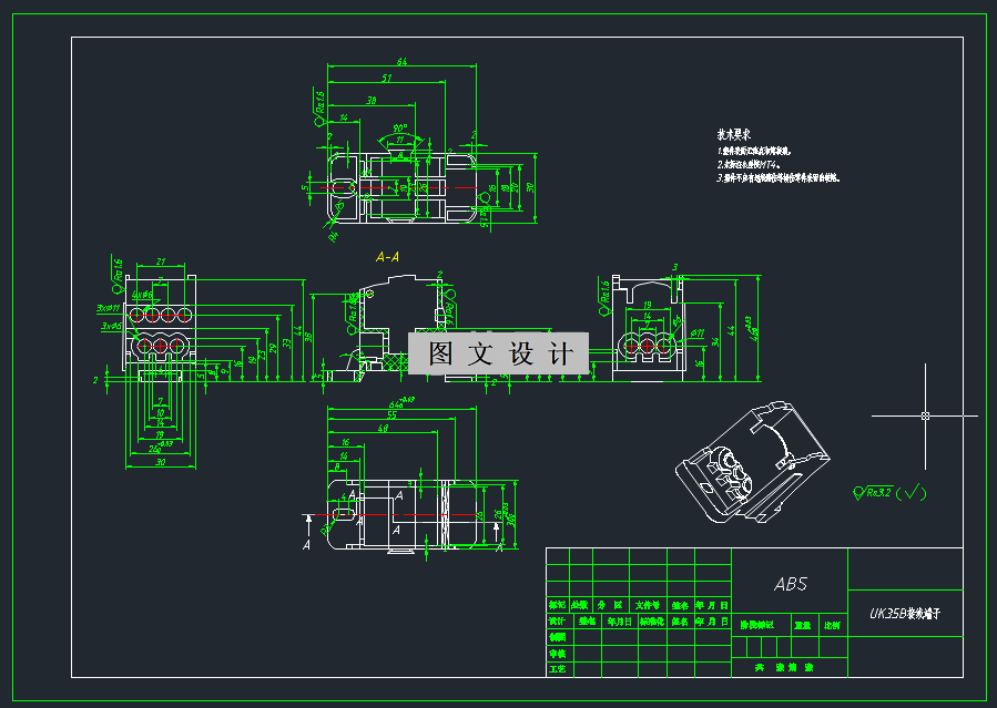 本课题的研究对象是来自工业电气行业常用的UK35B接线端子,首先对模具课题背景和对国内外研究现状进行阐述,然后对此塑件的外观特点和结构特点进行分析,确定好材料和模具设计方案,并且选择了合适的型腔数目,为一模一腔,在根据其塑件的体积,初步选择注塑机,确定其型号为HTF86,分型面的选择和塑件的外形特点有联系,根据塑件的外形边缘特点,确定了分型面是在塑件的最大外形处,同时观察塑件外观和侧面的结构,选择了浇注形式为直浇口的结构,接着对模具的冷却系统和脱模系统等进行设计分析,确定了环绕式冷却和推杆的顶出方式,最后根据已知结构零件尺寸确定好了模架,然后针对设计出来的模具与注塑机进行相关参数校核,比如注塑机自身基本参数校核,对最大注射量和最大锁模力等校核,还有模具的安装装配时的尺寸是否匹配等等,最终完成了整套模具的3D设计和2D设计。