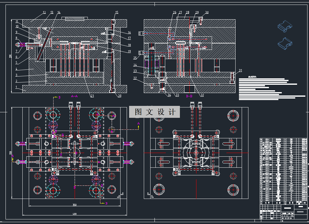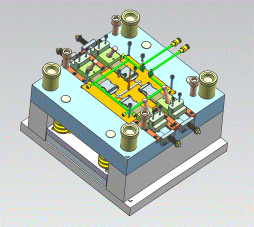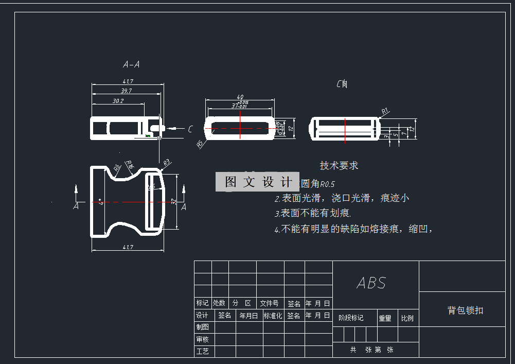本次设计主要内容为成型背包锁扣设计一套塑料模具方案,在开展方案设计之前首先对背包锁扣结构做出了分析,然后根据其使用要求为背包锁扣选择合适的ABS材质,本次设计型腔数目为一模四腔的结构,本次设计中浇口形式采用了侧浇口进胶的方式,通过三维软件获得了产品体积,并对本次模具选定了型号注塑机及龙记标准CI模架型号。确定了模具最佳分型面位置,然后对主要的模具结构比如浇注系统、脱模机构、模具冷却系统进行详细的设计及计算。在成型零部件设计时,对成型零件的结构形式做出了选择并对成型零件的成型尺寸进行计算。最后对所选注塑机型号进行了校核。