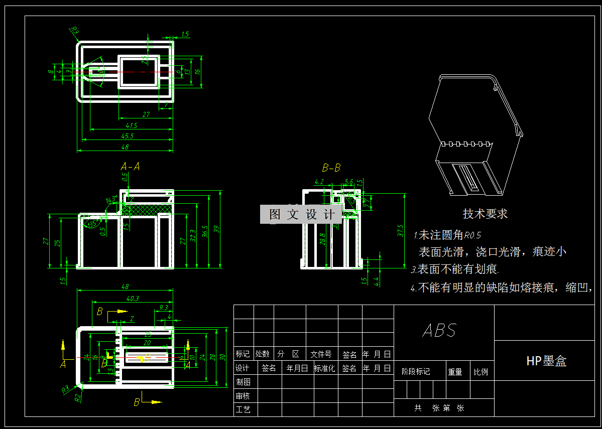 根据HP墨盒的使用要求选择了合适的材质。开题之后运用相关软件对产品进行三维建模导出二维零件图,随后完成HP墨盒塑件的结构分析,然后确定了本次模具设计最佳分型面位置和模具型腔腔数为一模四腔,注塑机以及明确了模具的分型面,浇注系统,型腔数量和布置方式等设计。选择模架优先于选择标准模架。在分析和计算塑料零件的尺寸后,注塑机的型号为HTF86,并选择底面最大截面作为分型面。计算成型零件的型腔与型芯的尺寸,并设计。温度调节系统设计的是冷却系统。本设计使用侧浇口的方案,是由于要HP墨盒要采用一模四腔。通过对各个零件进行了二维图的绘制以及采用CAITA软件进行三维的建模,最后将整套模具顺利设计完成通过对HP墨盒注塑模具的设计;