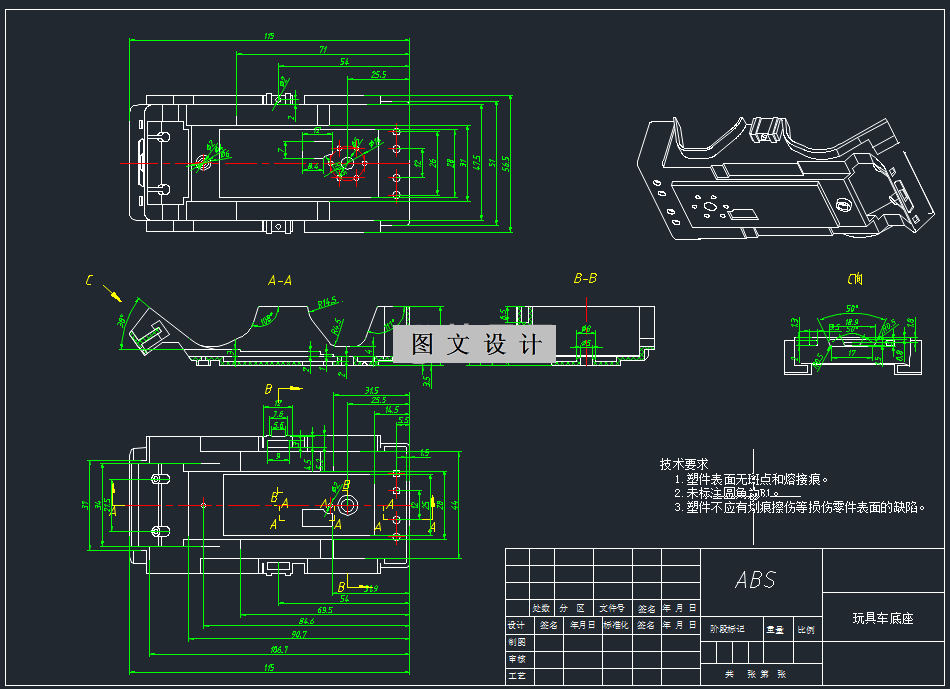 本文主要对成型玩具车底座的注射模具内主要结构进行设计计算的过程进行了阐述,通过分析玩具车底座工艺性及其精确度的要求,对注射成形工艺技术作出合理的分析,而塑件尺度的成形制造性包括了塑件的壁厚、表面粗糙度及其尺寸准确度。并通过对塑件尺度的加工工艺分析,来明确注射成形的工艺参数、注塑机以及明确了模具的分型面,浇注系统,型腔数量和布置方式等设计。选择模架优先于选择标准模架。在分析和计算塑料零件的尺寸后,注塑机的型号为HTF200J/TJ,并选择底面最大截面作为分型面。计算成型零件的型腔与型芯的尺寸,并设计。温度调节系统设计的是冷却系统。本设计使用侧浇口的方案,是由于要玩具车底座要采用一模两腔。本次模具采用分型面和推杆缝隙排气而没有单独开设排气系统,脱模机构采用了推管元件。综上所述来完成本次设计。