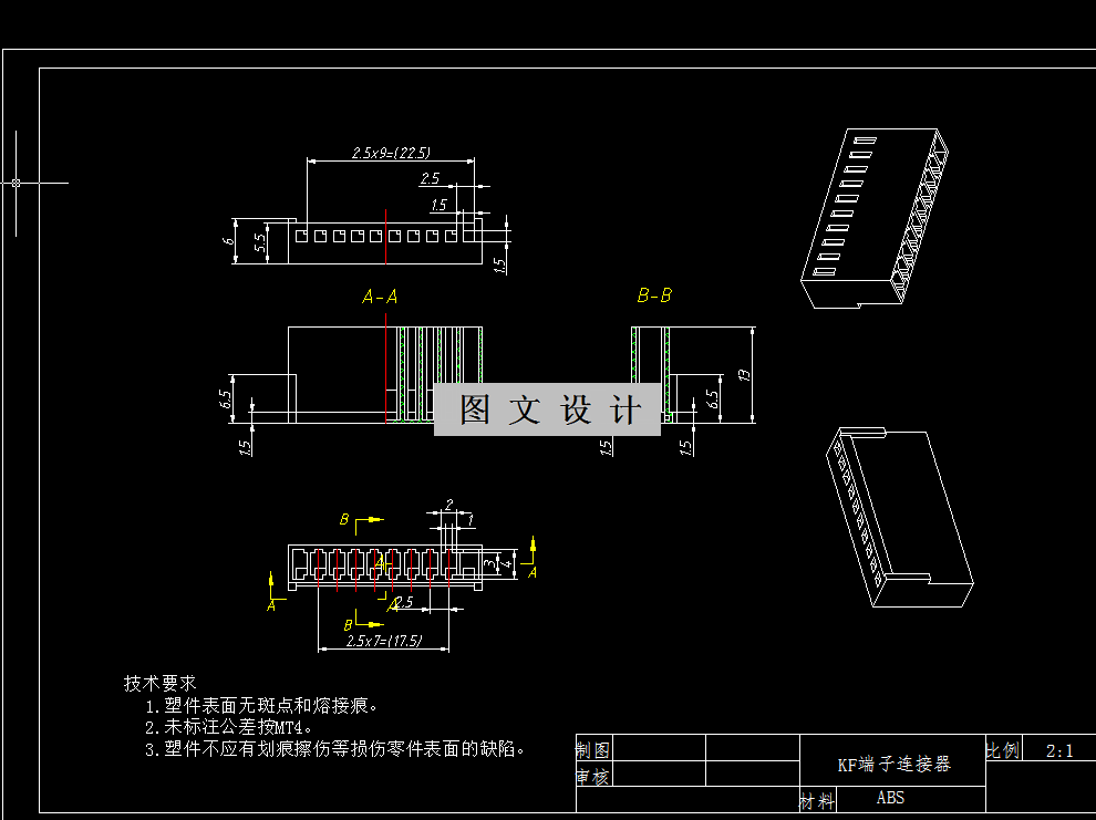 随着科学技术的发展,机器越来越智能化,机器自动化工作就离不开配电柜以及相关软件程序,接线端子就是配电柜中大量用到的电气连接件,第2章完成结构分析及其KF端子连接器的选材,决定采用一模4腔,侧浇口,大水口两板模具。在开始进行模具结构设计之前运用三维绘图软件和AUTOCAD二维绘图软件对KF端子连接器三维立体图及产品零件图进行绘制,从KF端子连接器产品的成型结构特征开始、到对分型面分析及位置的选择、模具浇注系统设计、型芯型腔结构设计和尺寸计算,脱模推出机构、冷却系统、导向机构的设计等多方面详细叙述了KF端子连接器注射模大致设计过程。与此同时合理地选用了注塑机型号,而且对注塑机压力,锁模力及顶出力等工艺参数进行详细校核,进而保证了设计的合理性及正规性。如此设计出的注射模结构才能确保模具工作运行可靠。