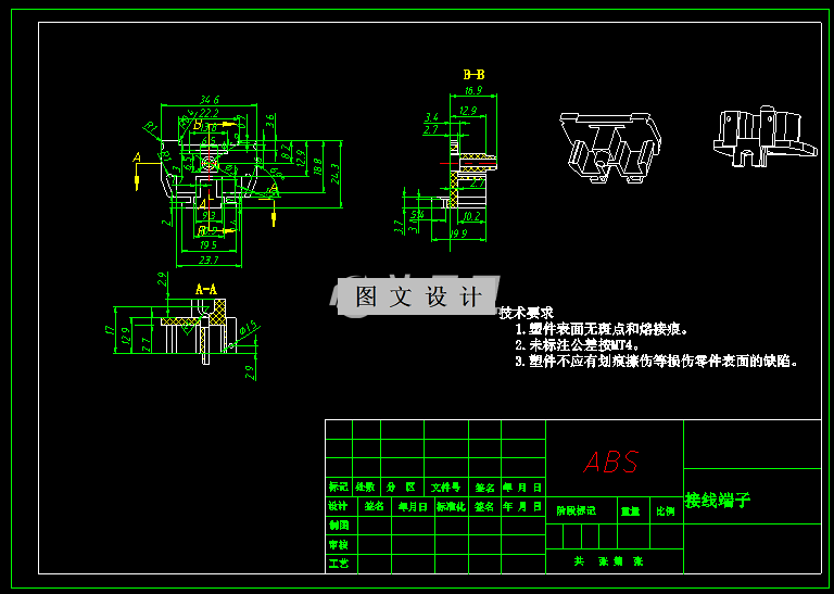 首先对TBC接线端子结构进行分析,在网上查找了适合的材料,通过注塑方式成型。在对塑料产品的模具结构设计过程中,本设计主要设计要点如下:分型面的选择有利于TBC接线端子成型;脱模机构的设计不但结构简单,而且脱模动作稳定可靠;进浇口选择不影响TBC接线端子零外观,而且保证TBC接线端子充填均匀;冷却水道的设计使注塑模具效率达到最高,保证TBC接线端子零件盖质量要求;本次设计型腔数目定为一模四腔,浇口形式采用了侧浇口,对于塑件上的侧孔,本次设计还单独设计了抽芯机构成型TBC接线端子零件的侧孔结构。经过不懈努力完成本次模具设计全部任务
