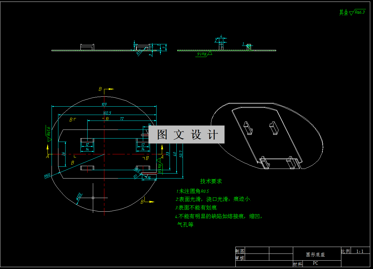 本设计按照设计要求,分析零件形状、尺寸和精度,分析塑件结构特性,合理的注塑工艺。在模具设计阶段分析塑件与注塑机的配合关系,确保塑件的加工质量稳定,两板模具的结构方式进行模具设计。本设计明显地降低了生产成本,保证工件的位置精度体现速度和效率的统一。在经过对塑件进行结构和工艺性分析之后,该圆形底座外形尺寸属于中型塑件,且塑件外观无特殊要求。利用PROE和AUTO CAD软件绘制了二维图和三维图,在清楚地表达模具结构的同时,也缩短了设计时间,提高了效率