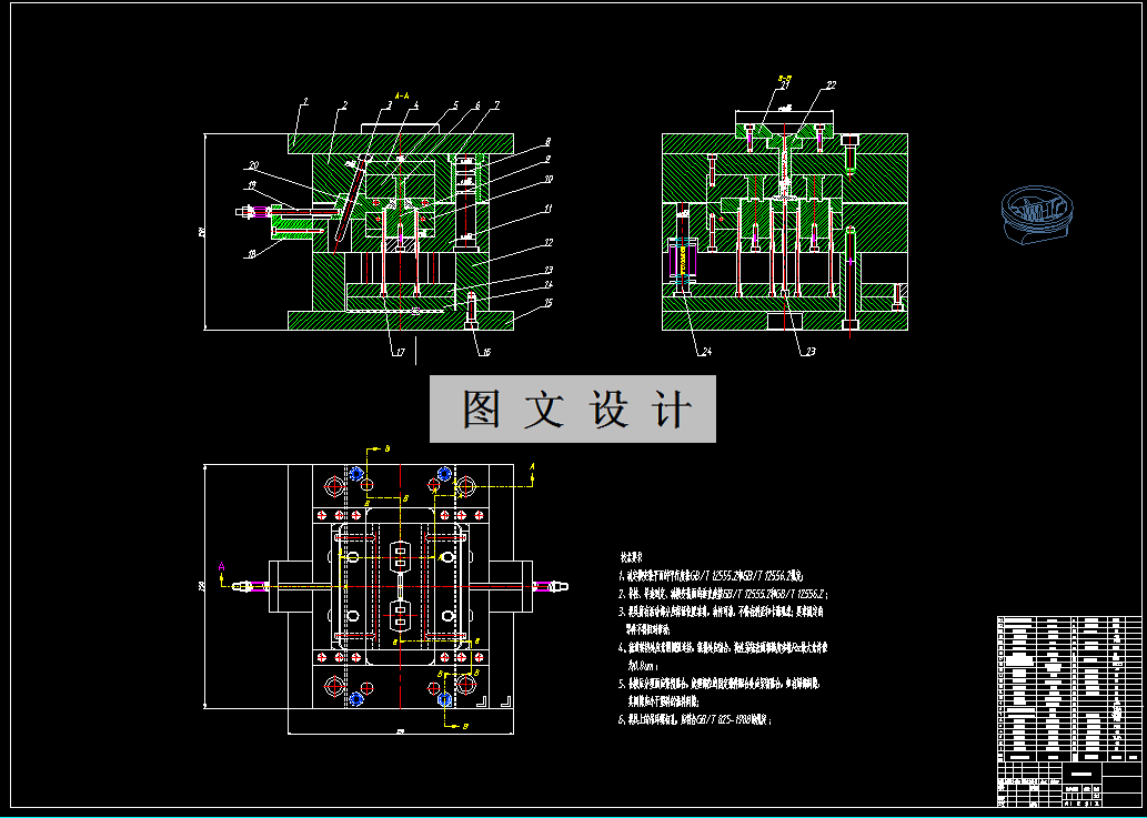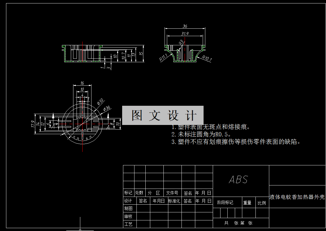 对产品的塑料原材料进行了选择并做出分析,初选了注塑机型号为SZA-YY60。由于产品有装配要求,尺寸精度要求比较高,由于产品型腔数目决定采用一模两腔结构,型腔排布采用一字型排列方式,本次设计分型面位置选在了沿着产品底面形成的最大轮廓面处,由于产品表面要求不高,所以选择了侧浇口浇口类型,本次设计的脱模机构选择了推杆脱模方式。由于产品外表面处存在一圈凹槽结构,这些结构设计是本次设计的难点,需要设计抽芯机构,借助抽芯机构成型,最后经过分析,认为此次的塑料模具设计还需要设计一套模具冷却系统,这样能够提高产品的成型质量。最后对注塑机主要参数进行了校核。