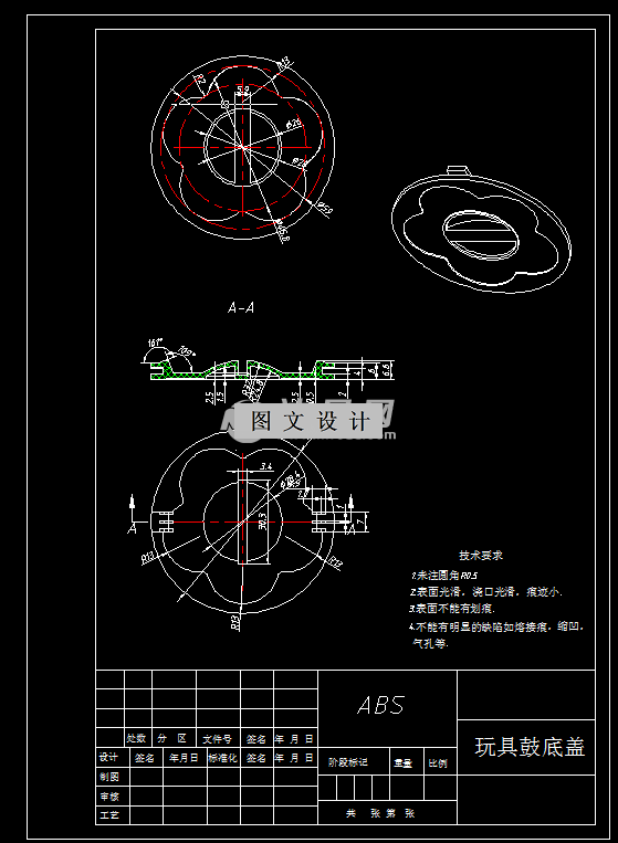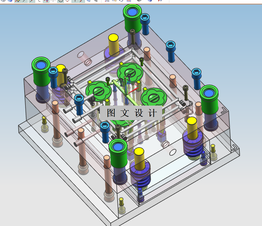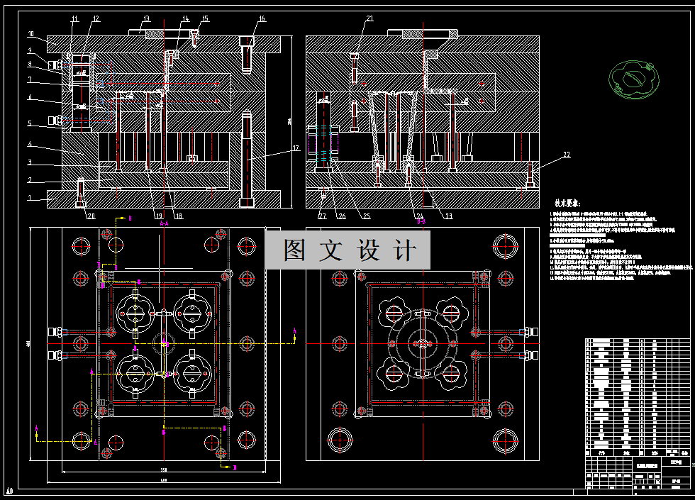在设计过程中,分别采用了ProE和CAD软件,其中,前者主要是进行零件造型;而后者是帮助我设计得出了塑件的体积和重量,并对结构型式以及浇注系统、推出机构、型芯型腔的结构设计有很大设计帮助。经过一系列的设计,得出一张符合比例要求的总装配图。在设计中主要的重点也是难点是冷却系统以及侧抽芯方面。模具型腔数目采用了一模四腔结构,在抽芯方面使用了斜顶杆抽芯。优点在于结构简单,满足了精度的要求,材料的用量上可以节约一部分,在生产效率和经济上可以很大的提升。