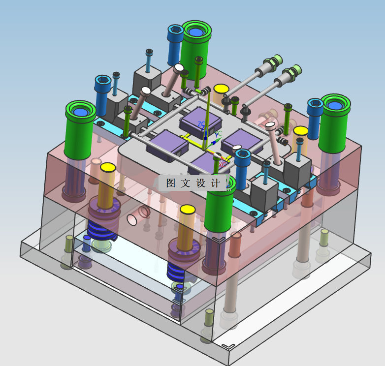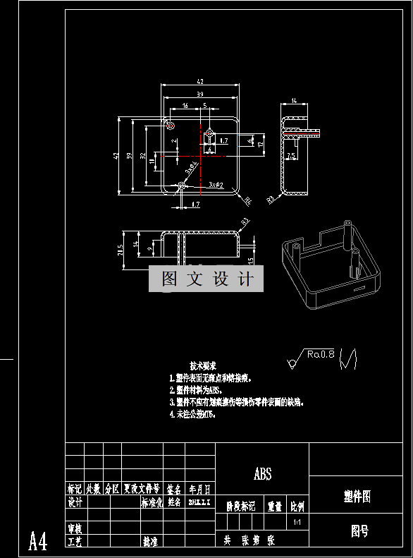 对此塑件的结构特点进行分析,确定最佳模具设计方案,并且选择了合适的型腔数目,为一模4腔,在根据其塑件的体积,初步选择XS-ZY-125型号注塑机,确定了分型面位置在塑件的最大外形处,选择了浇注形式为侧浇口的结构,对模具的冷却系统和脱模系统、导向机构等进行设计分析,确定了环绕式冷却和推杆和推管的顶出方式及导柱导套导向,最后根据已知结构零件尺寸确定好了模架,然后针对设计出来的模具与注塑机进行相关参数校核,比如注塑机自身基本参数校核,对最大注射量和最大锁模力等校核,保证所选注塑机符合要求。