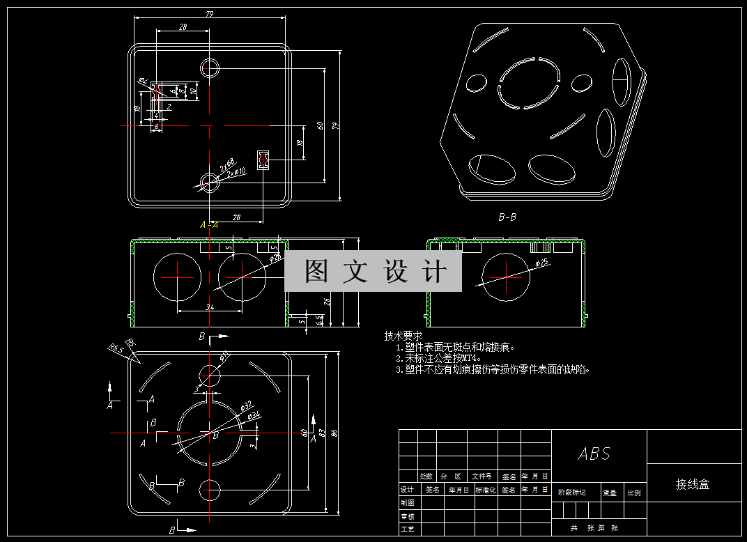 分析户外接线盒结构以及成型工艺性,为户外接线盒选择合适材料ABS,确定型腔数目为一模一腔方案,然后确定分型面位置,紧接着展开了浇注系统,脱模机构,抽芯机构,模具冷却调温系统的设计,然后为成型零部件结构形式进行选择,并计算成型零部件的主要尺寸,本次模具设计所选注塑机的型号为HTF160J/TJ,通过校核注塑机主要参数,验证所选型号注塑机满足要求,本次模具所采用的模架为AI模架。最后根据以上所设计的内容,通过所掌握的二维和三维软件完成了模具装配图、模具三维装配体以及模具零件图绘制。 关键词:户外接线盒;AI模架;