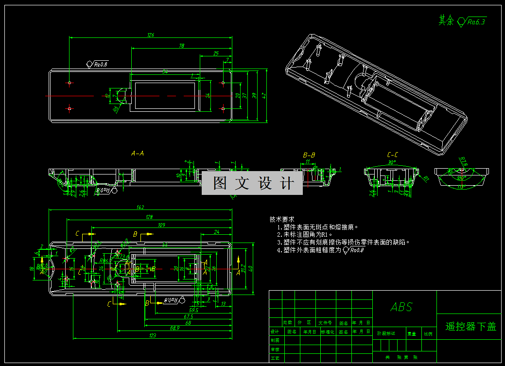 通过对电视遥控器上盖进行成型工艺分析和模具设计,介绍了注塑模设计的基本过程。包括对塑件结构的工艺性分析和使用材料的工艺性分析,在模具设计中,介绍了注塑机的选择方法,浇口,冷料口、排气槽等的设计,还详细介绍了型腔数量确定的方法,分型面、侧向抽芯机构、合模导向机构、脱模机构、冷却机构等的设计原则。通过此次设计,可以对注塑模的发展和设计方法有一个基本的认识,能注意到设计过程中的细节问题,了解模具结构和工作原理。