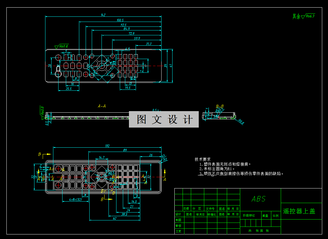 通过对电视遥控器上盖进行成型工艺分析和模具设计,介绍了注塑模设计的基本过程。包括对塑件结构的工艺性分析和使用材料的工艺性分析,在模具设计中,介绍了注塑机的选择方法,浇口,冷料口、排气槽等的设计,还详细介绍了型腔数量确定的方法,分型面、侧向抽芯机构、合模导向机构、脱模机构、冷却机构等的设计原则。通过此次设计,可以对注塑模的发展和设计方法有一个基本的认识,能注意到设计过程中的细节问题,了解模具结构和工作原理。 1185194