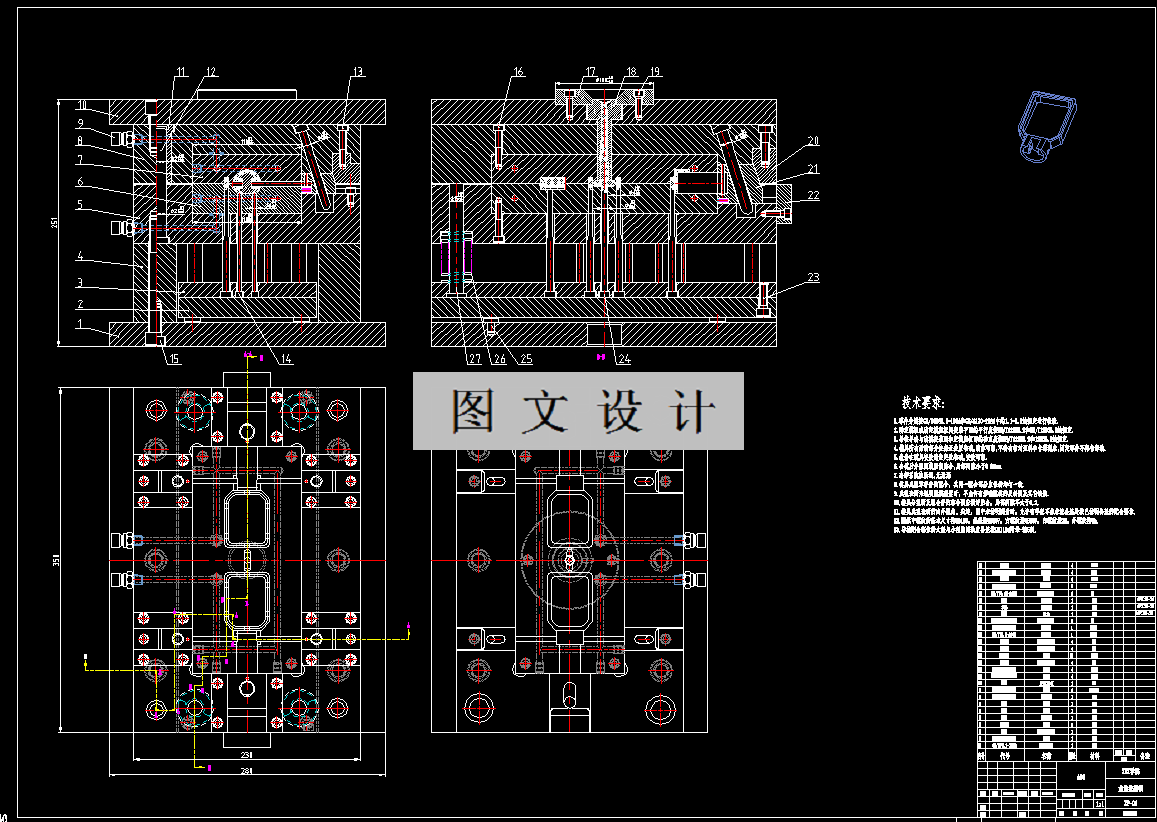 工业在社会发展过程中占据主导地位,工业技术更是代表一个国家的生产力水平,然而模具就被认为是工业的基础,模具中就少塑料注塑成型及模具,塑料制作的产品已经普及到了,与每个人生活息息相关,对塑料产品的社会需求也随之增加,对于开发设计合乎实际生产需要的模具的研究显得更加必要。本次模具设计课题是研究塑料拉手模具成型方案的设计,主要做了以下内容,分析塑料拉手结构以及成型工艺性,为塑料拉手选择合适材料ABS,确定的型腔数目方案为一模二腔,为了减少侧抽芯的数量确定分型面位置为中间面,紧接着展开了模具主要结构的设计,包括浇注系统,脱模机构,抽芯机构,冷却控温系统设计,最后选择成型零部件的结构形式,同时计算其部件的主要尺寸,本次模具设计所选注塑机的型号为XS-ZY-125,通过对注塑机主要参数的校正,来确定所选型号的注塑机各个参数是否符合要求。
