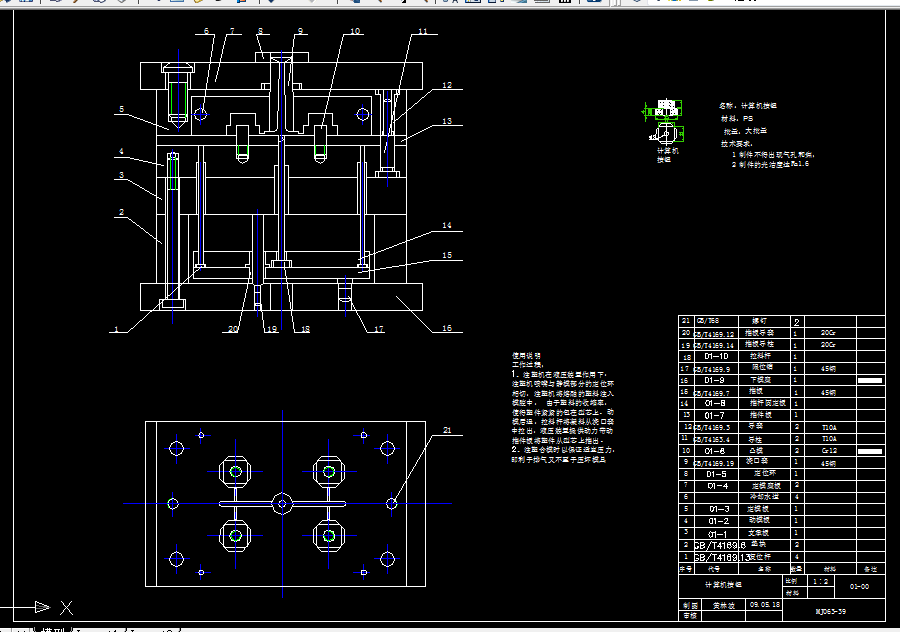 根据PS 的性能,通过查阅机械制造手册,合理控制塑件的收缩率,确定模具型腔、型芯的设计尺寸及强度计算校核,锁模力平衡的确定、浇道系统设计、浇道和浇口平衡校核;计算机按钮结构不需要侧抽芯机构,抽芯力的计算;冷却系统设计;推出机构设计、计算推顶力;排气方式选用。