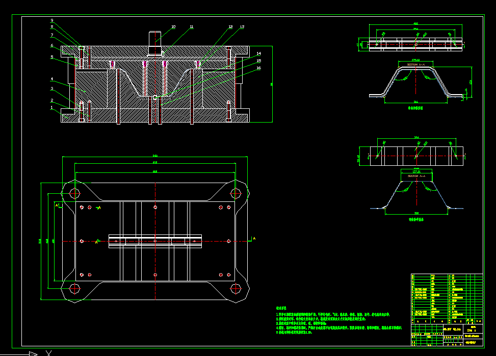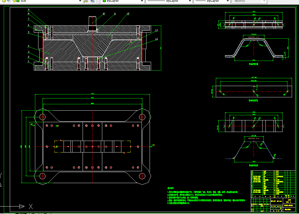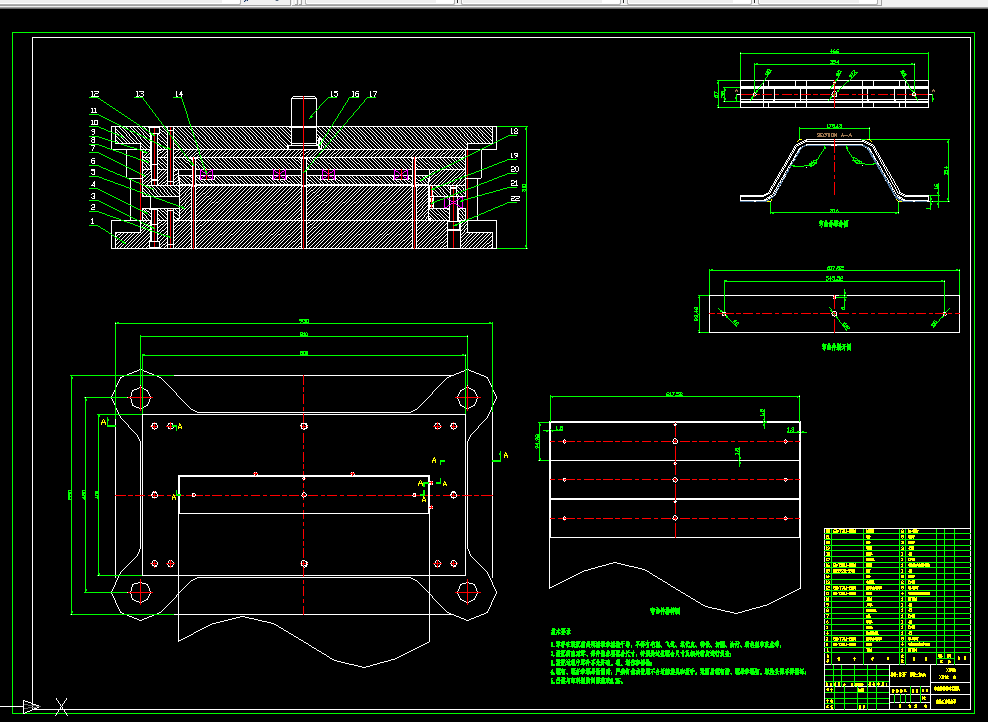 本次模具的工序较多且很复杂,其中工序包括冲孔、弯曲、落料等。重点在于弯曲工序的设计处理上,弯曲工序形式多样,有多处、对称、Z型弯曲等。