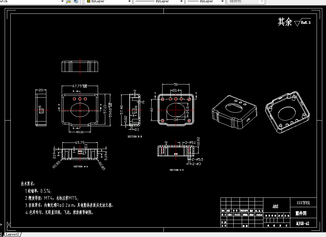 本次模具设计的工作还在于将运用CAD制图软件把模具所有的零件都绘制出了CAD电子图档,当然,还有装配图。在计算机的辅助下对塑件的各机构及模架进行了设计绘画,另外在绘制零件图时还需要考虑到零件的制造工艺,保证零件强度足够,易加工,便捷更换。以上因素在设计过程中都需要综合考虑。